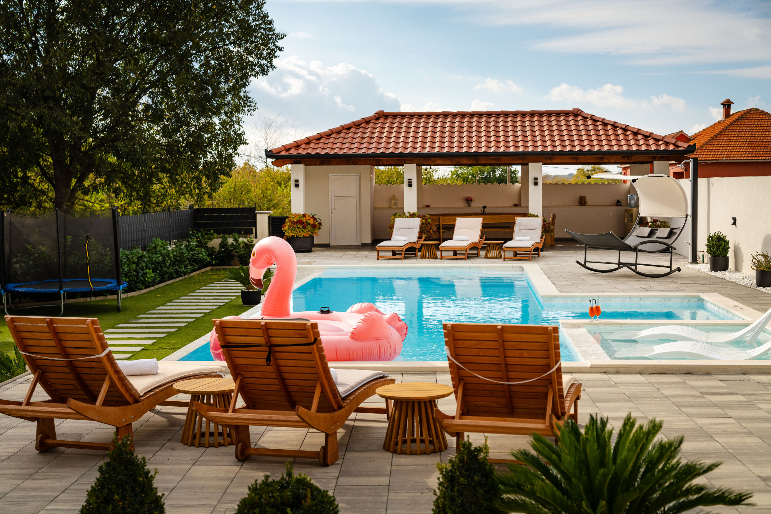 La piscina privada también tiene una mini piscina para niños adjunta. Su increíble zona exterior cuenta con un gran barbacoa de piedra tradicional, un parque infantil, una encantadora taberna equipada con una mesa de comedor y un baño adicional, 2 duchas solares, numerosas tumbonas, muebles de jardín y mucho más.