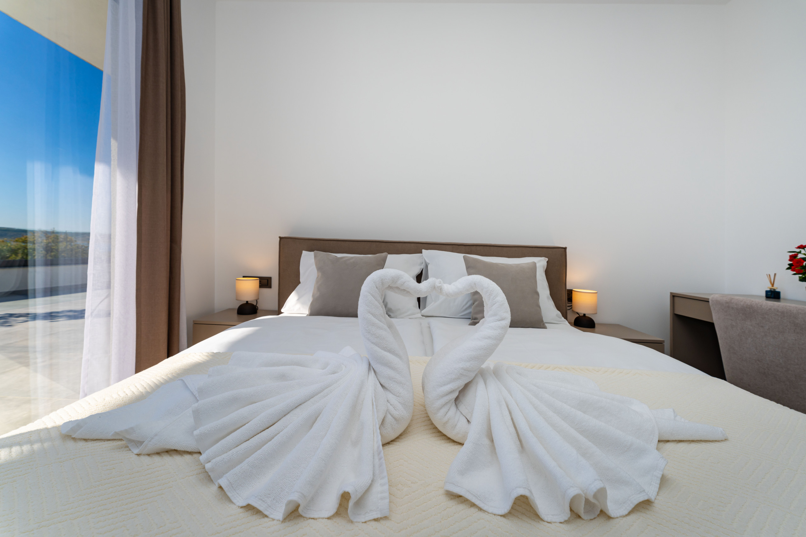 Cada unidad ofrece tres dormitorios modernos, cada uno con baño en suite, aire acondicionado y TV, así como una terraza espaciosa con vista al mar con muebles de exterior cómodos para sus momentos de relajación. También hay 2 salas de estar/comedor bien iluminadas y 2 cocinas completamente equipadas. Hay un total de 6 dormitorios con baños en suite, lo que hace de Villa Senti una opción perfecta para familias o grupos de amigos.