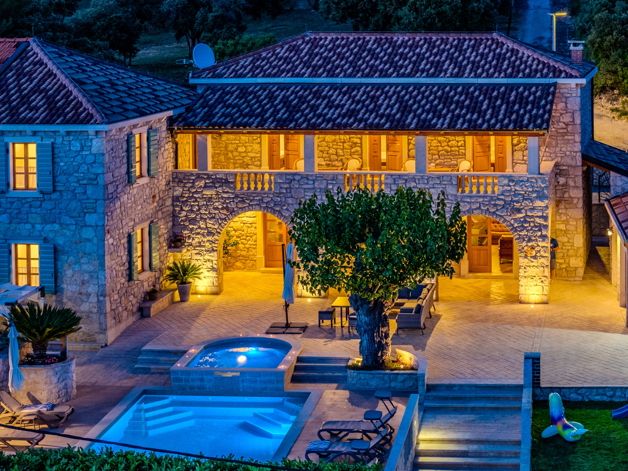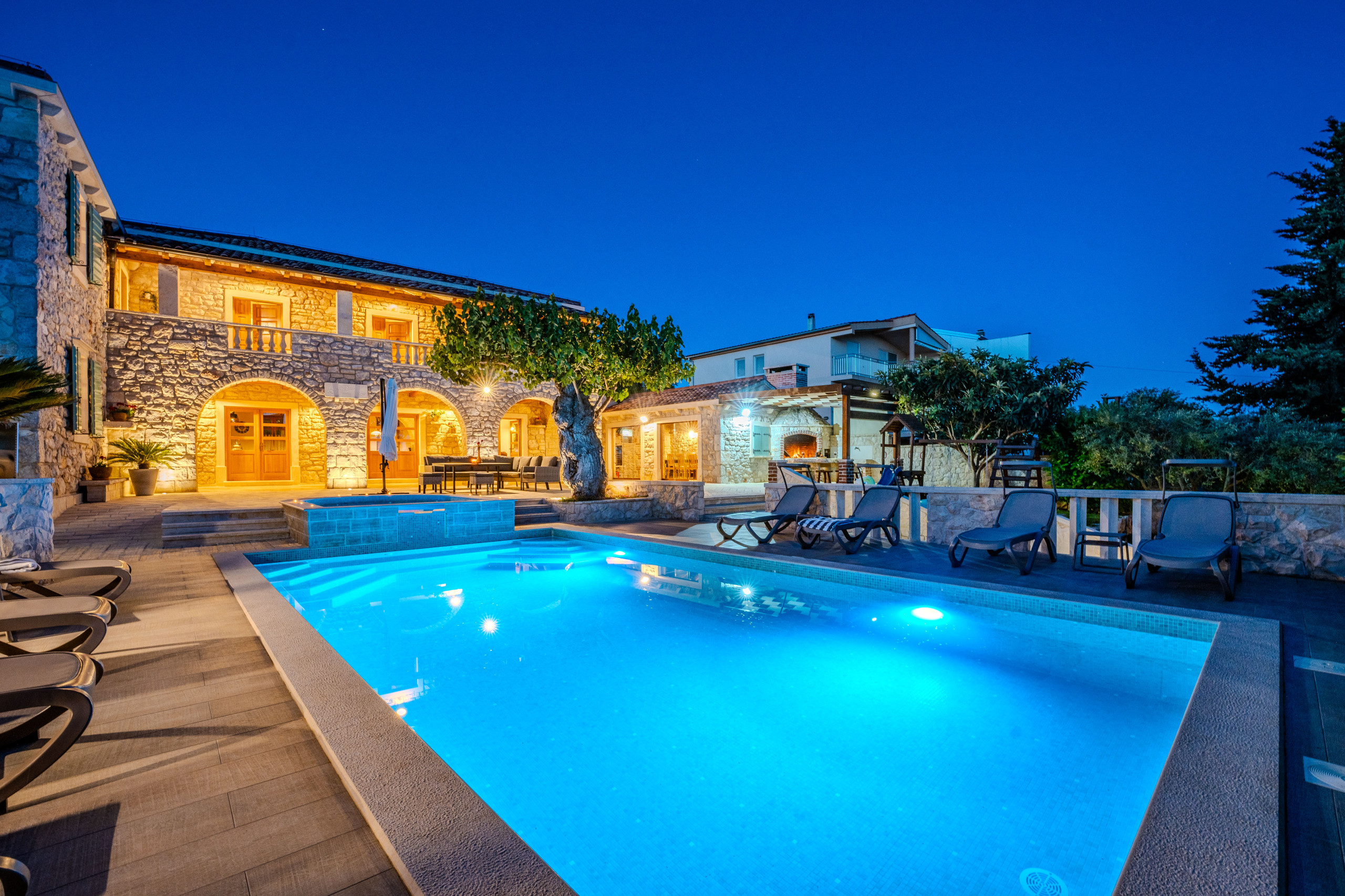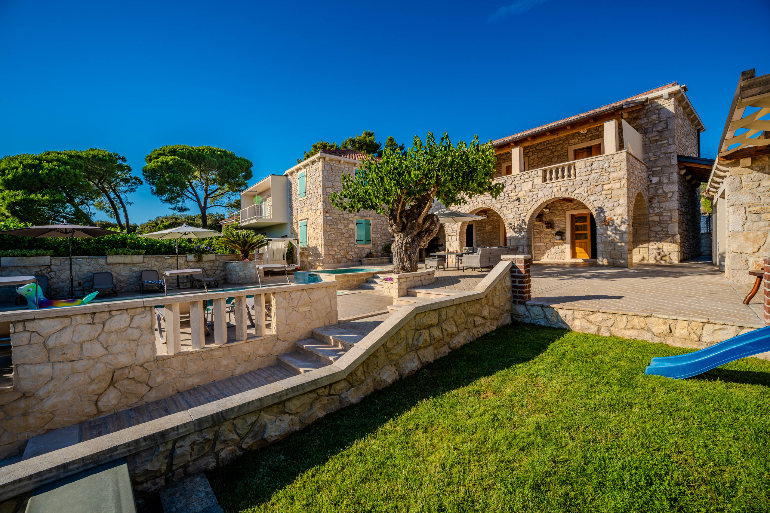 En el exterior, los huéspedes son recibidos por una piscina privada climatizada de 50 m², tumbonas, sombrillas, una casa de barbacoa y una terraza con vistas al mar Adriático. Para aquellos que viajan con coches eléctricos, Villa Dumina ofrece una estación de carga de vehículos eléctricos en el lugar. Los huéspedes más jóvenes están bien atendidos con un parque infantil y una piscina infantil separada. El uso extensivo de la auténtica piedra dálmata realza el carácter atemporal de la villa y su conexión con el entorno.