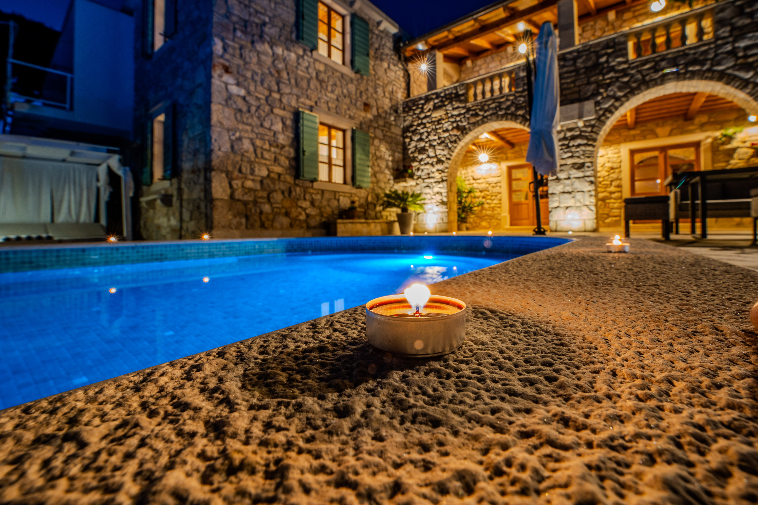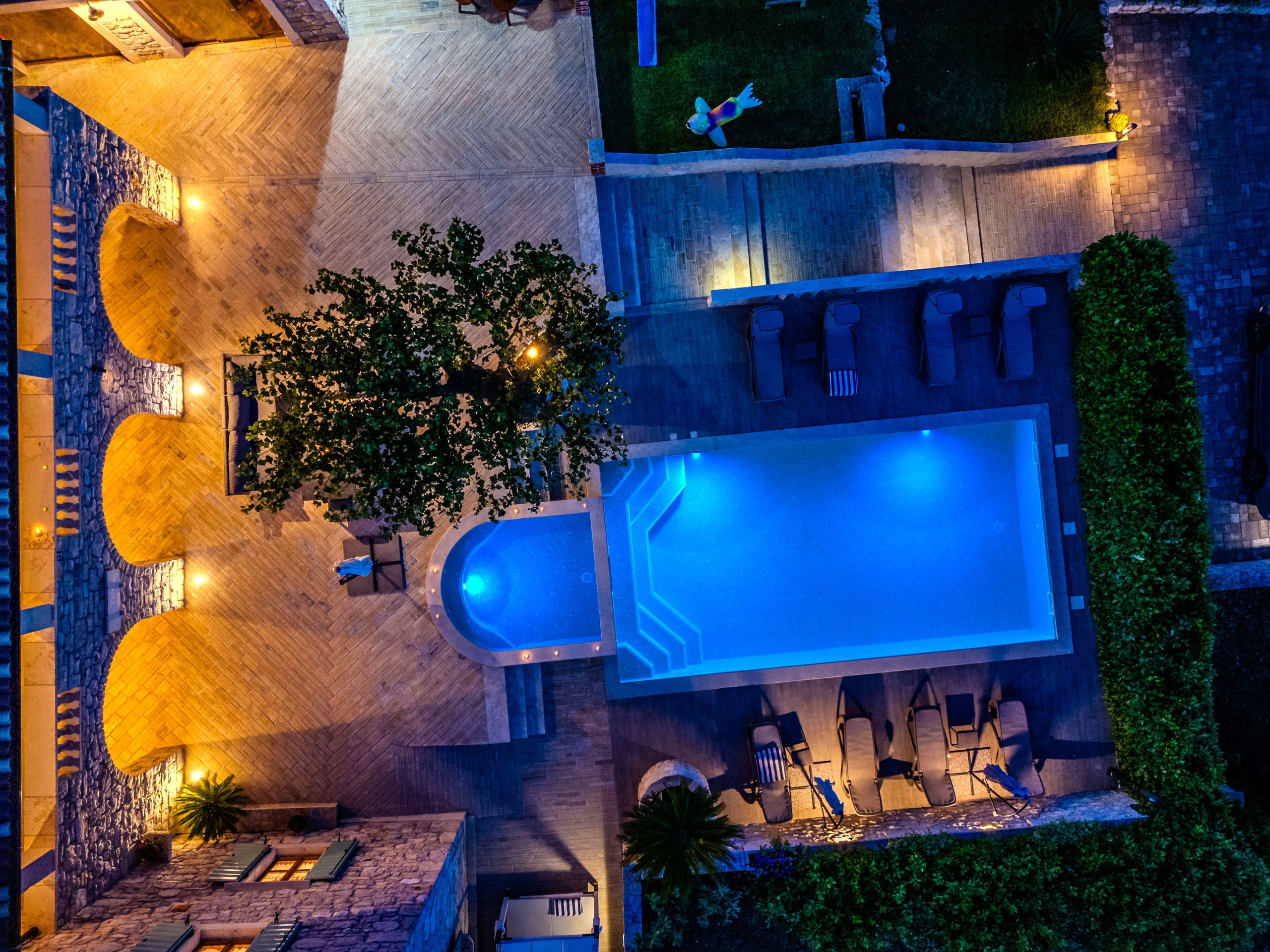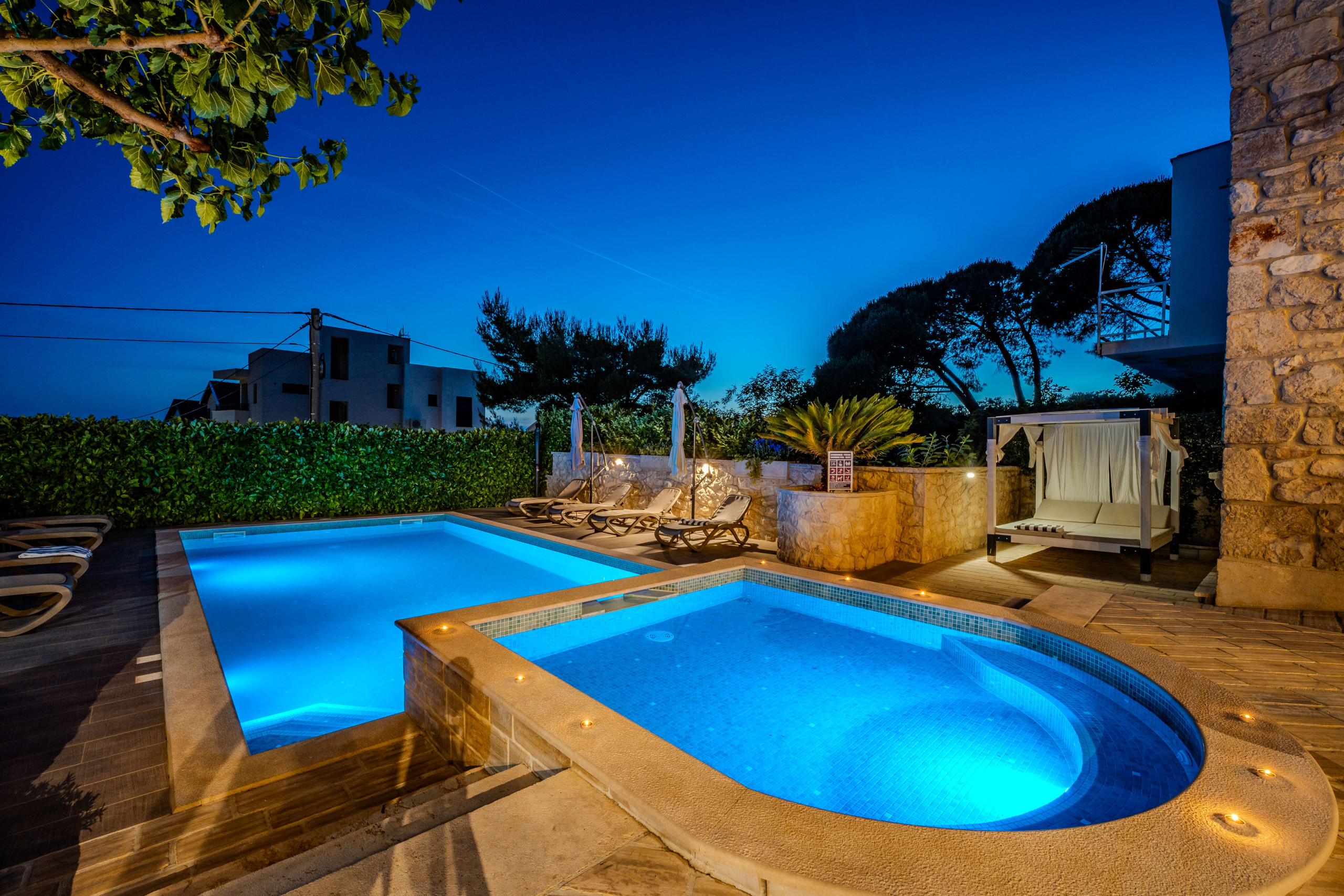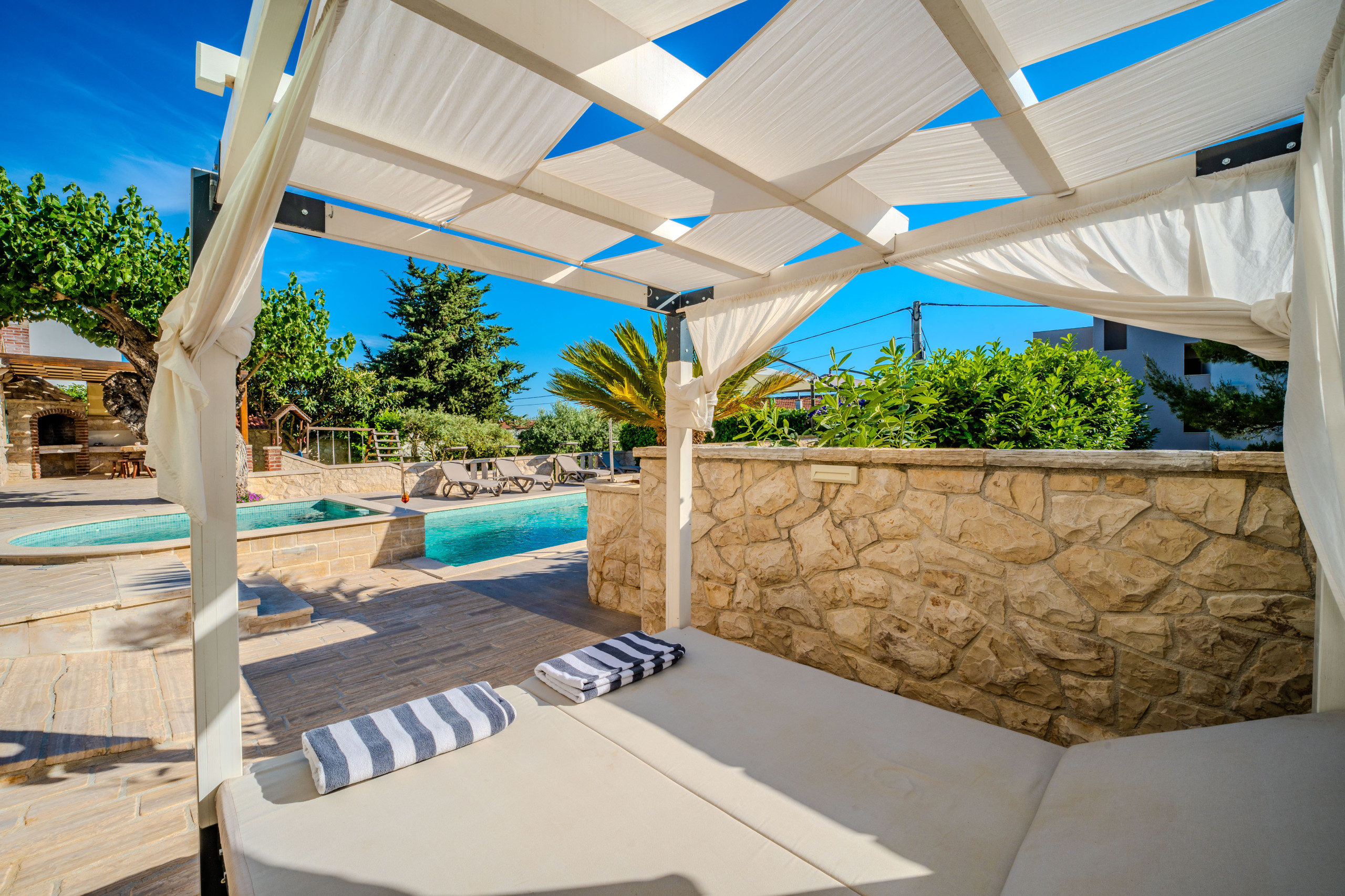 En el exterior, los huéspedes son recibidos por una piscina privada climatizada de 50 m², tumbonas, sombrillas, una casa de barbacoa y una terraza con vistas al mar Adriático. Para aquellos que viajan con coches eléctricos, Villa Dumina ofrece una estación de carga de vehículos eléctricos en el lugar. Los huéspedes más jóvenes están bien atendidos con un parque infantil y una piscina infantil separada. El uso extensivo de la auténtica piedra dálmata realza el carácter atemporal de la villa y su conexión con el entorno.