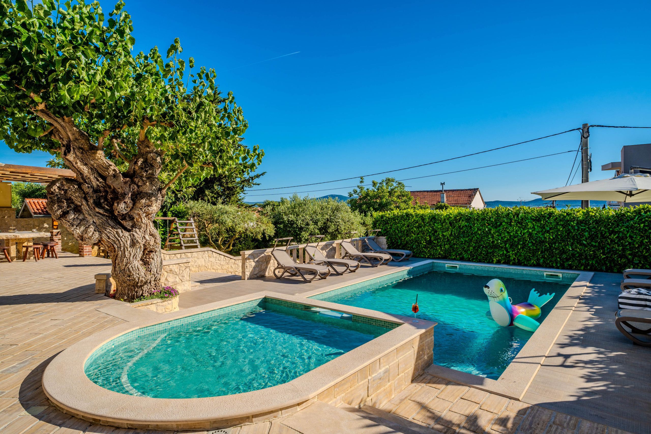 Villa Dumina es un impresionante retiro costero en Sukošan, diseñado para ofrecer a los huéspedes una experiencia dálmata auténtica y memorable. Con capacidad para 10 huéspedes, la villa cuenta con cinco dormitorios con aire acondicionado: tres con camas dobles y dos con camas individuales, cada uno con un baño privado y televisión de pantalla plana, garantizando comodidad y privacidad para todos. Seleccionada por My Dalmatia por su ubicación extraordinaria cerca de la playa y sus excelentes anfitriones que le harán sentir como en casa.