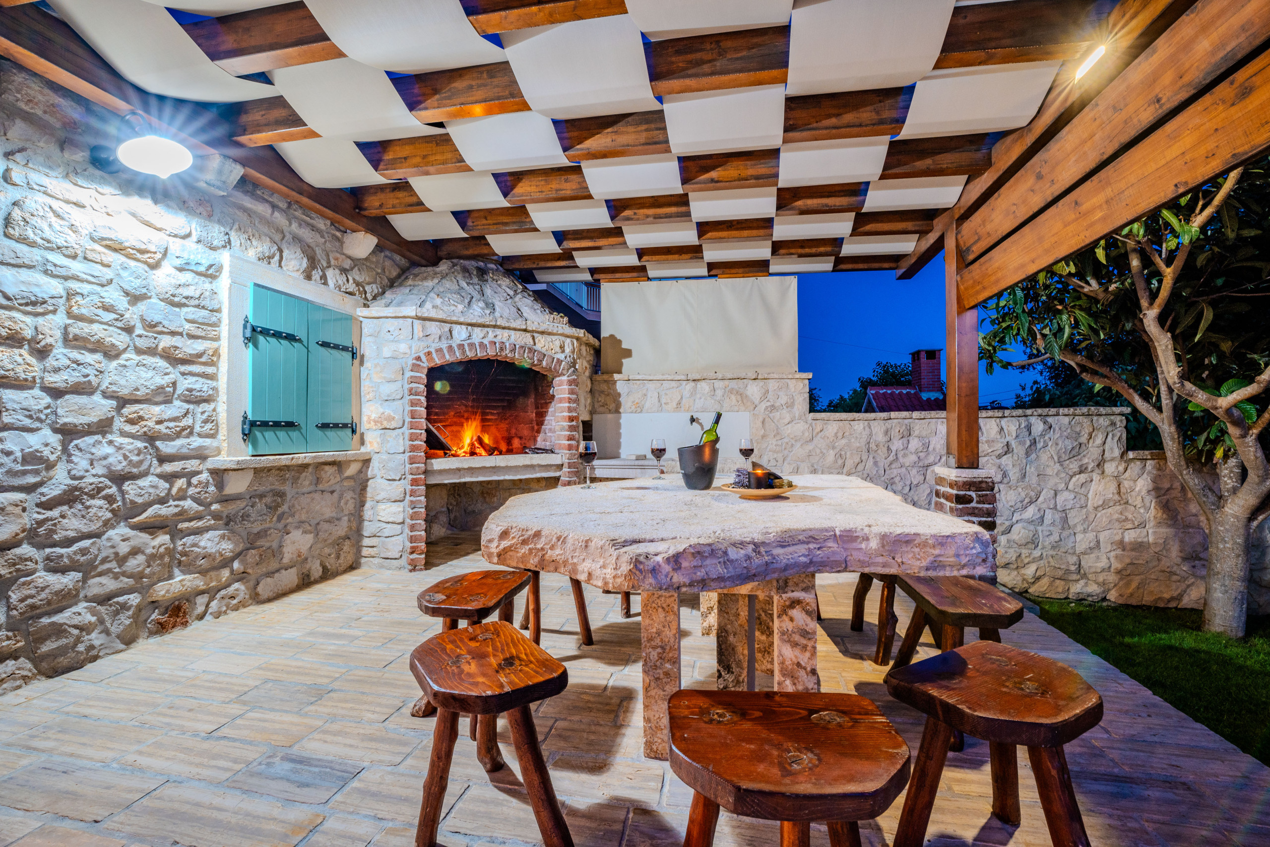 La villa incluye una cocina totalmente equipada, un amplio salón con asientos para diez personas y una acogedora chimenea que añade calidez y encanto. Para relajación y recreación, los huéspedes pueden disfrutar de tenis de mesa, bicicletas, un gimnasio interior y una sauna privada. Combinando elegancia rústica clásica con comodidades modernas, Villa Dumina muestra la arquitectura dálmata tradicional en todo su conjunto. Un punto destacado de la propiedad es su taberna dálmata tradicional, que cuenta con una chimenea de piedra y grandes puertas de vidrio, un entorno ideal para comidas compartidas y veladas inolvidables.