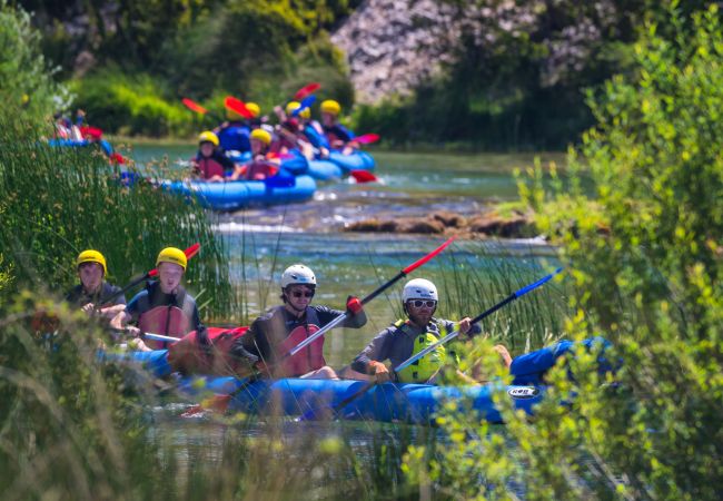 La excursión por el río Zrmanja es ideal para familias y grupos, y ofrece un lugar perfecto para refrescarse y escapar del calor del verano. El recorrido oficial tiene 14 km, comenzando desde el punto de partida en el pueblo de Kaštel Žegarski hasta la salida en el pueblo de Muškovci. La temperatura del agua varía entre 14 y 20 grados Celsius. El recorrido consta de dos partes. La primera parte tiene 7 km y es apta para principiantes; aquí aprenderemos a remar. En el kilómetro 7, encontraremos una gran cascada llamada Veliki Buk, de 11 metros de altura. Saldremos aquí, la rodearemos a pie y bajaremos las balsas/kayaks, marcando el inicio de la segunda parte del recorrido. Inmediatamente por encima de Veliki Buk, el río Krupa desemboca en el río Zrmanja. La segunda parte del recorrido es más rápida e intensa, donde saltaremos varias cascadas de 1m, 2m, 3m y 5m. En el kilómetro 14, en el pueblo de Muškovci, se encuentra la salida de nuestro centro donde podrás cambiarte en nuestros vestuarios. En la salida, puedes descansar con una bebida y nadar. Después de cambiarte, nuestros autobuses te llevarán de regreso a tus coches, tras lo cual te dirigirás a Mićanove Dvore, donde te espera el almuerzo (con previo aviso).