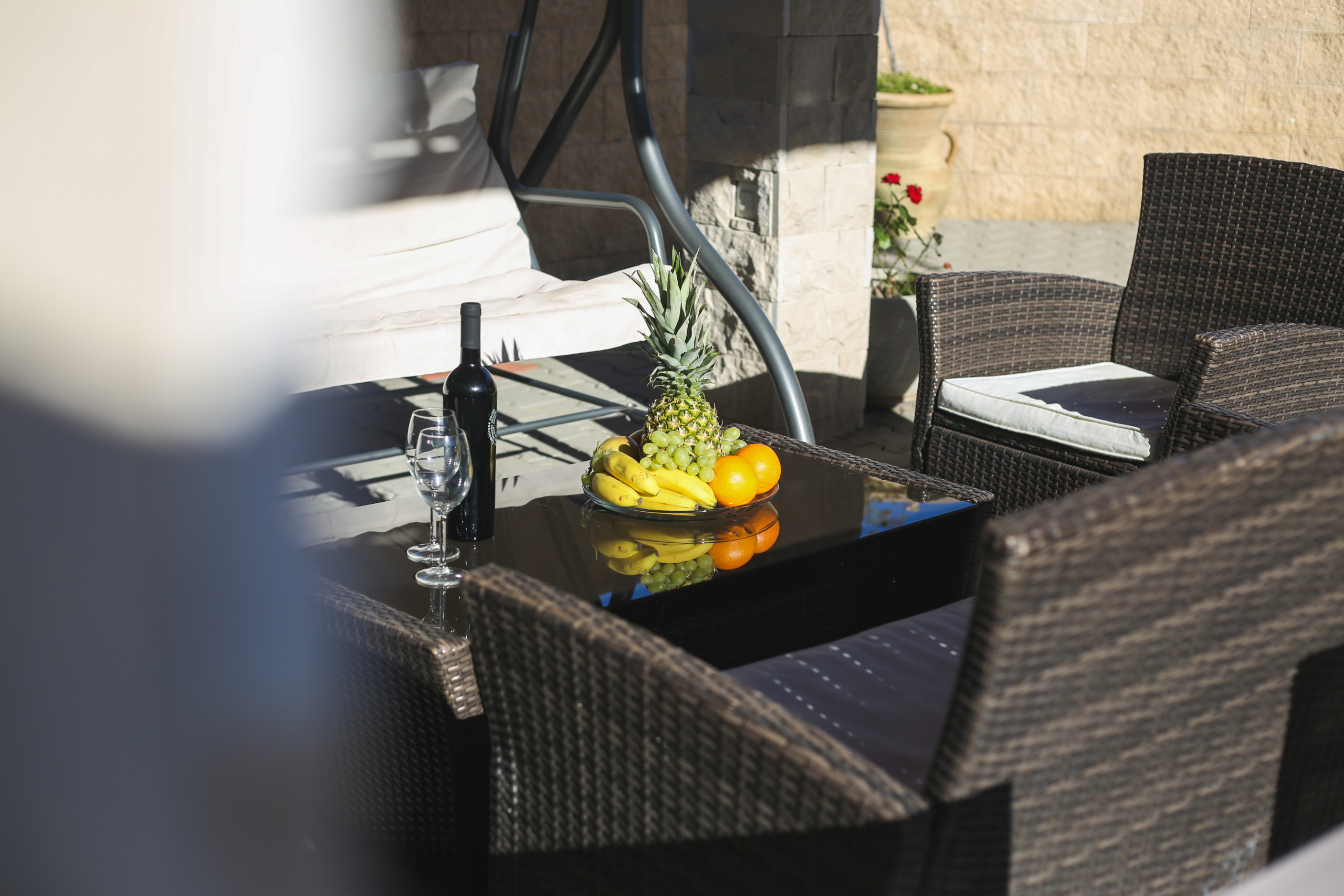 L'intérieur de votre appartement du premier étage se compose de 2 chambres, d'une salle de bains moderne, d'une cuisine ouverte entièrement équipée et d'un espace de vie/salle à manger qui donne un accès direct à la terrasse couverte charmante, bien équipée de meubles d'extérieur et d'une belle table à manger, idéale pour profiter de vos repas en plein air. Dans la cour entièrement clôturée, vous trouverez une piscine partagée, de nombreux transats, des parasols et une grande taverne traditionnelle avec des installations de barbecue. De plus, nous avons une place de parking couverte privée réservée pour vous.