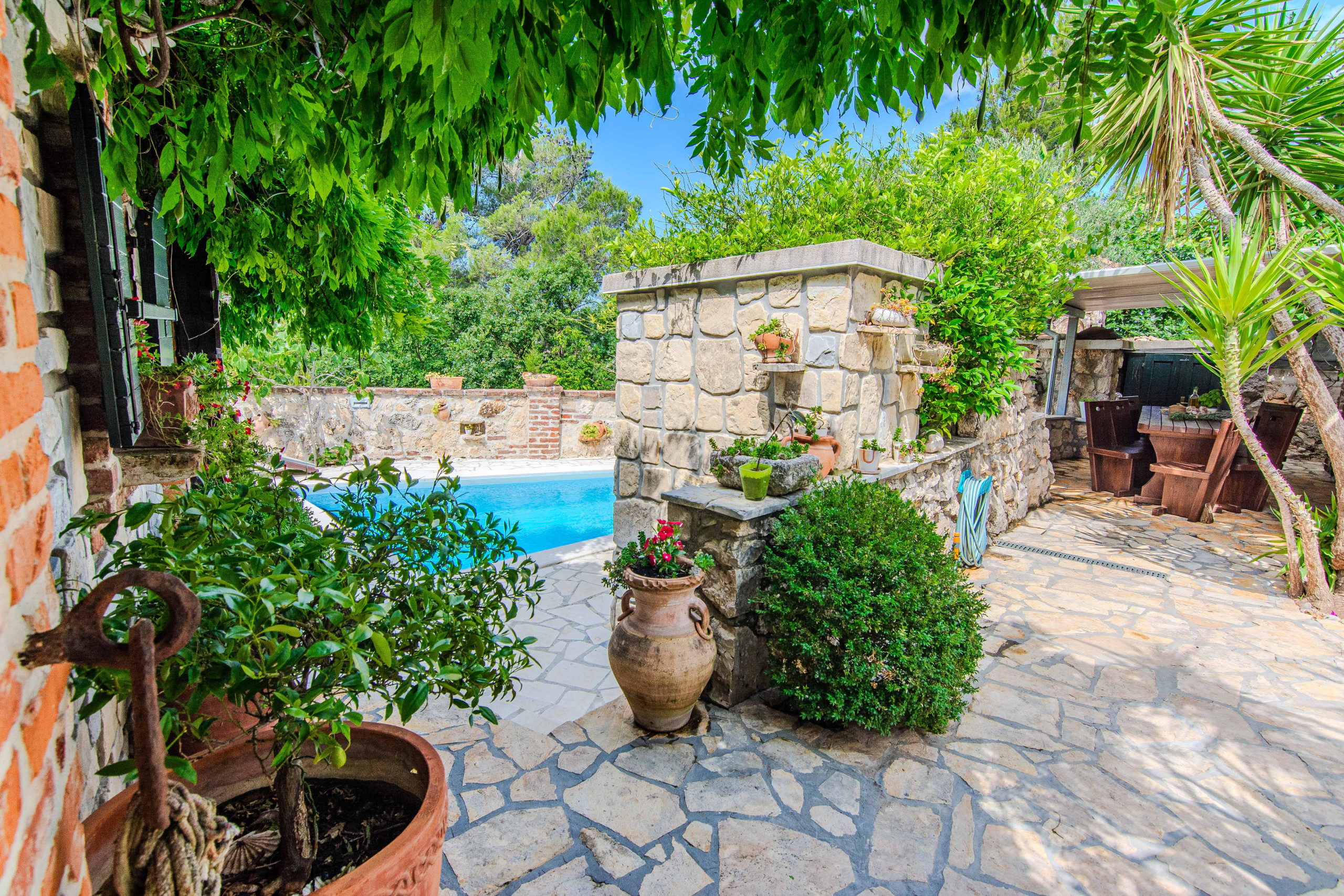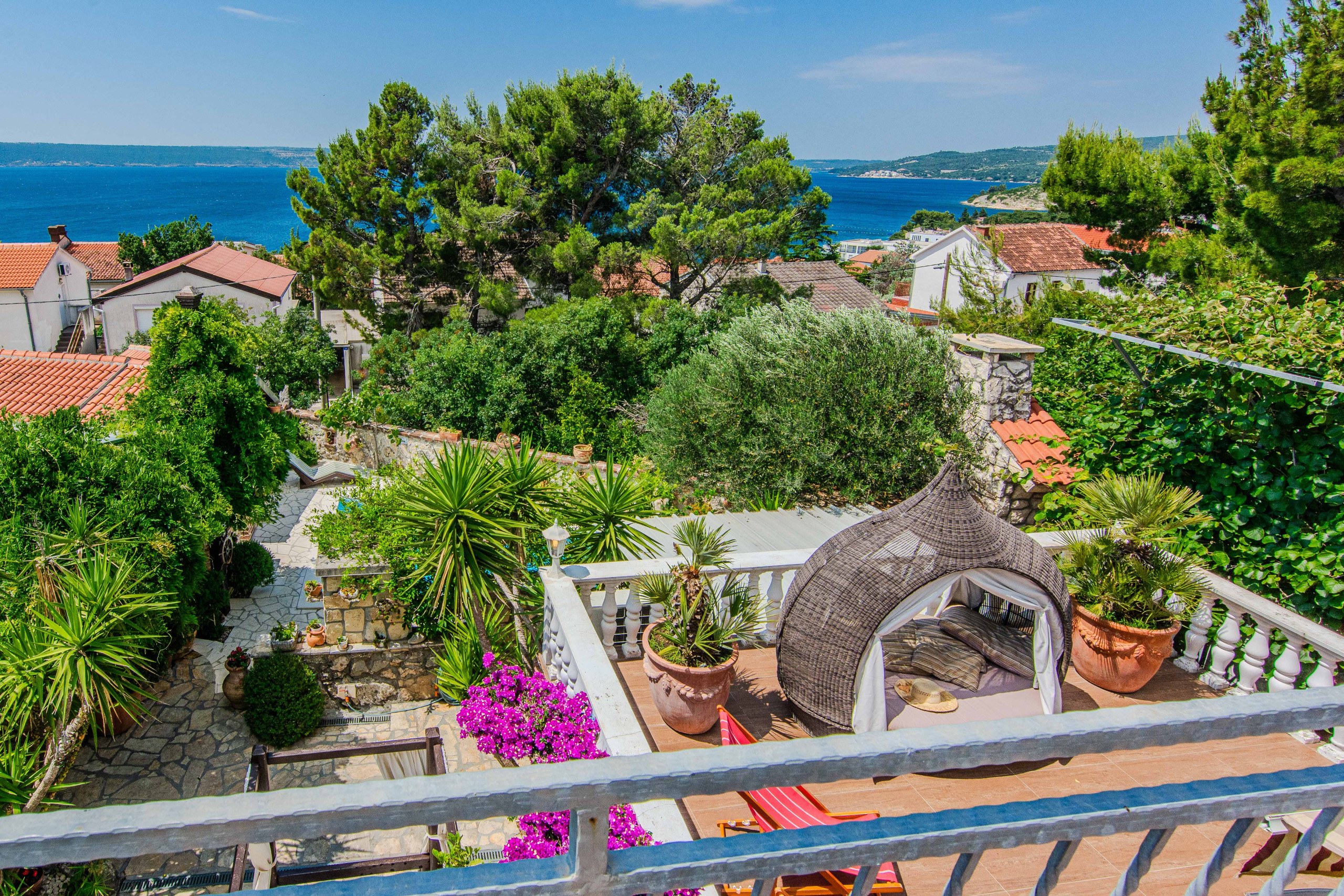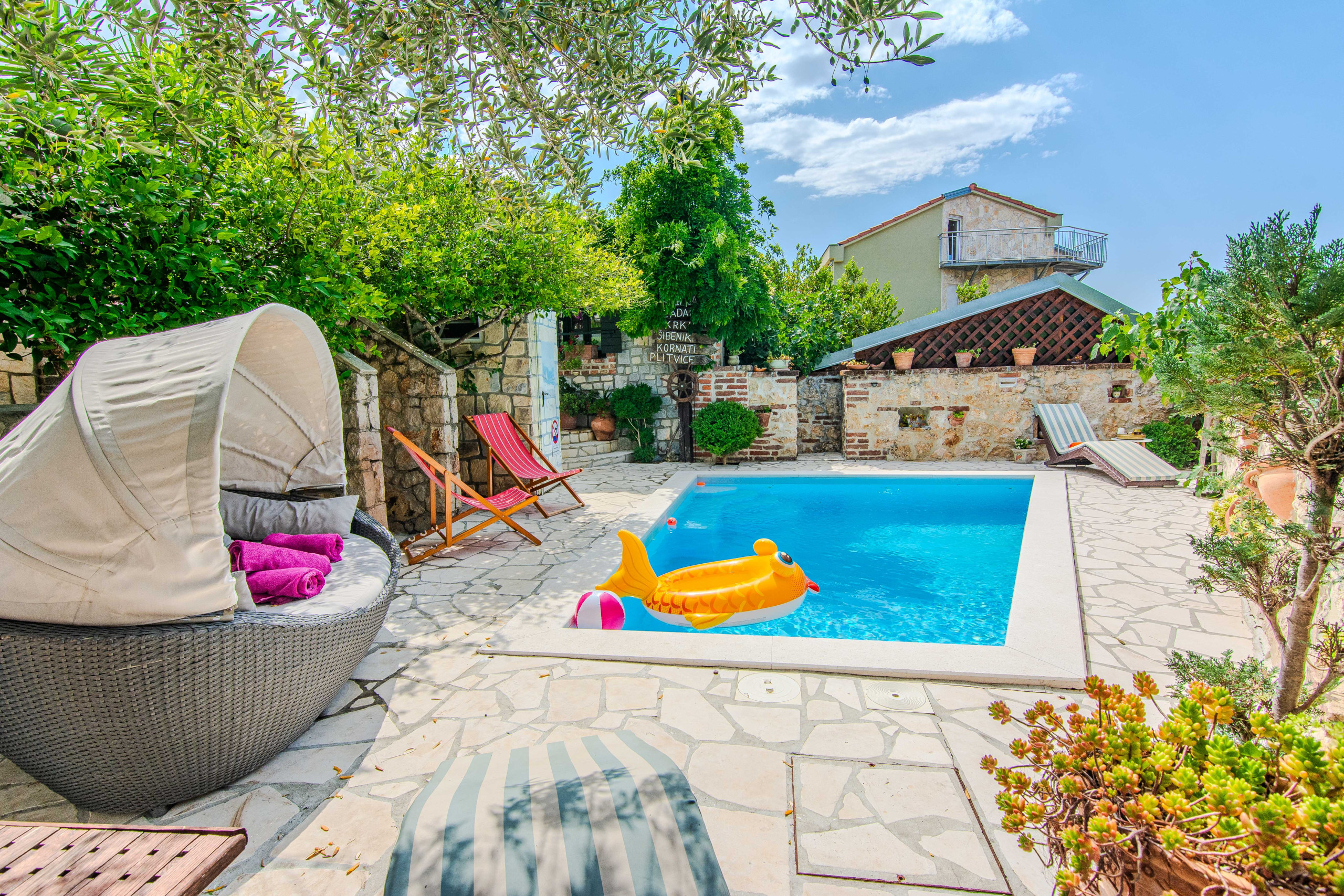Sélectionnée par My Dalmatia pour son atmosphère chaleureuse et sa proximité avec la plage. La Villa Danica se compose de 2 appartements entièrement équipés, chacun offrant un salon/salle à manger moderne, une cuisine entièrement équipée, deux chambres et une salle de bain. L'espace de vie du rez-de-chaussée a un accès direct à la terrasse de 40 m² avec de beaux meubles d'extérieur, tandis que l'étage supérieur offre un balcon avec une vue mer impressionnante. Le beau jardin propose une belle piscine, 2 terrasses couvertes, une charmante taverne et une salle de bain supplémentaire. La pièce typiquement dalmate appelée konoba avec une belle table en bois rustique, une cheminée ouverte et une cuisine entièrement équipée est tout simplement le lieu parfait pour profiter de vos repas d'été !