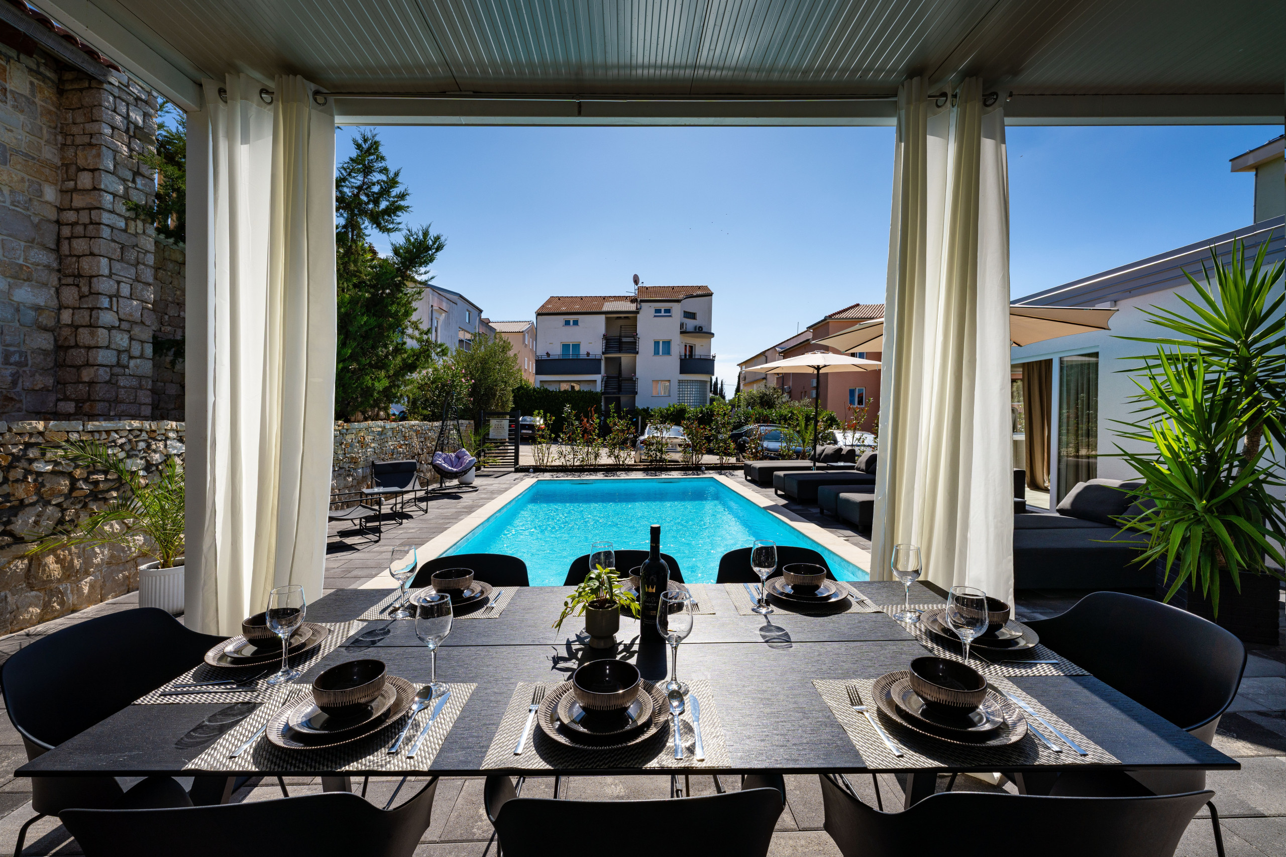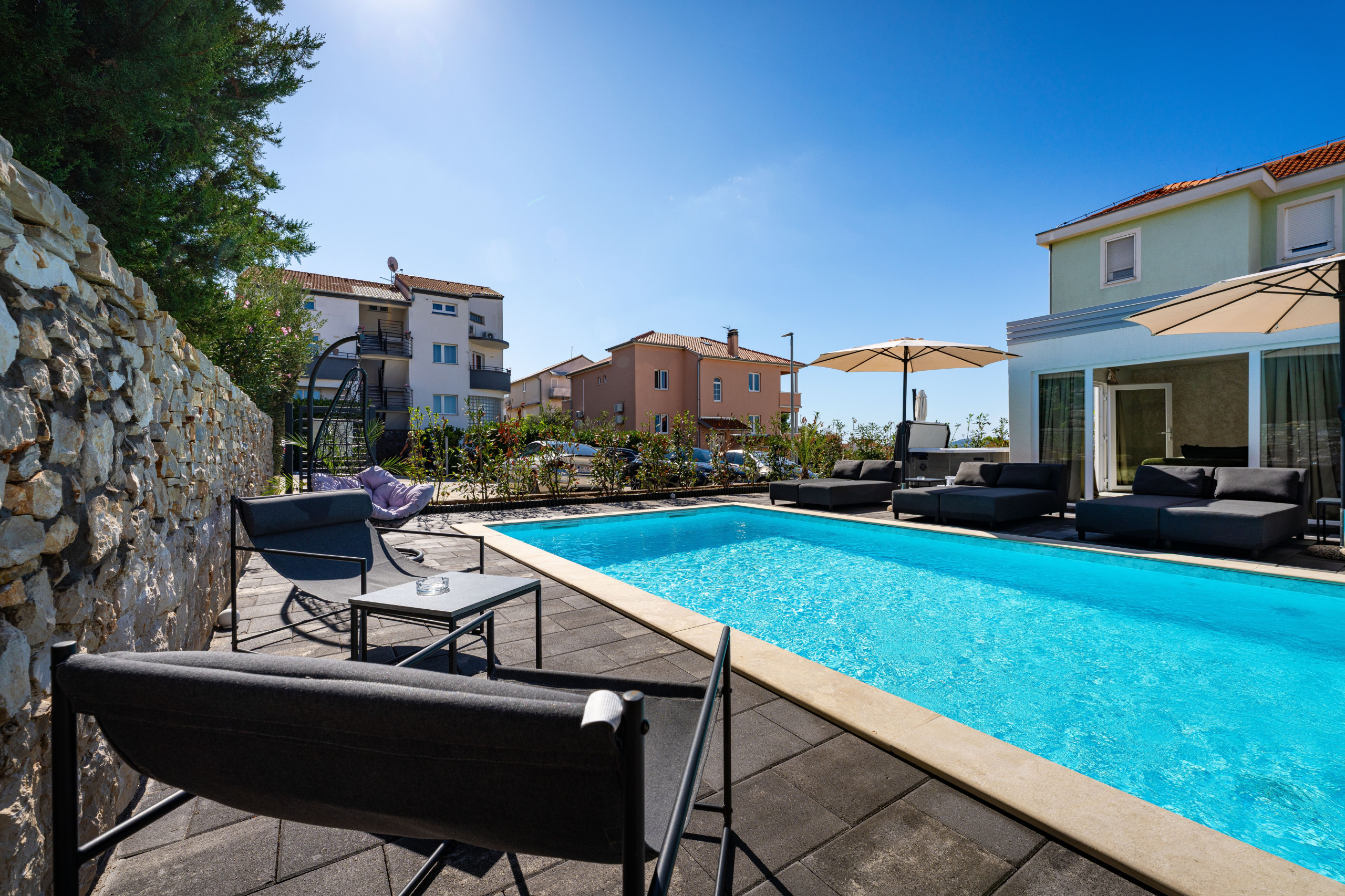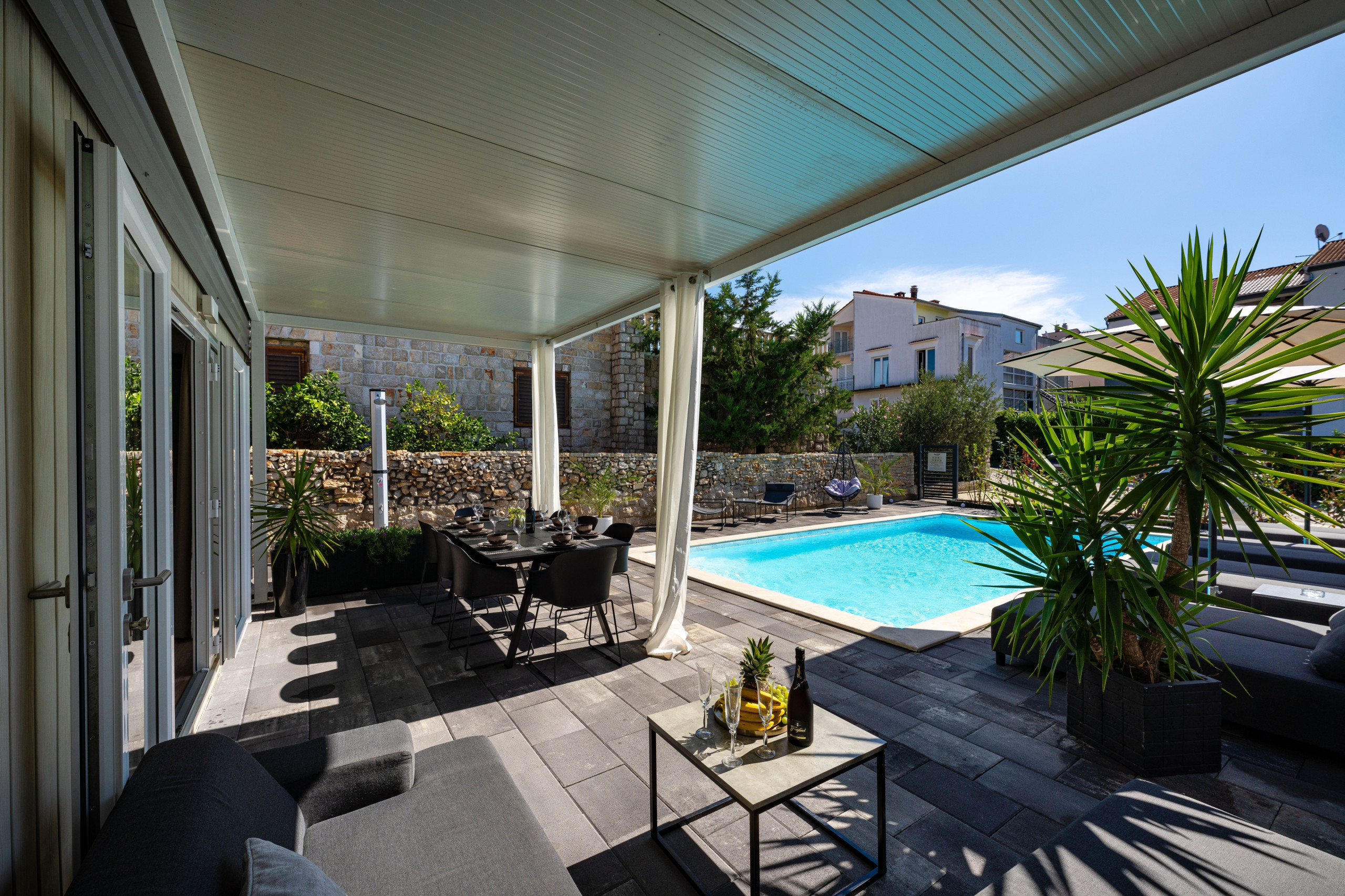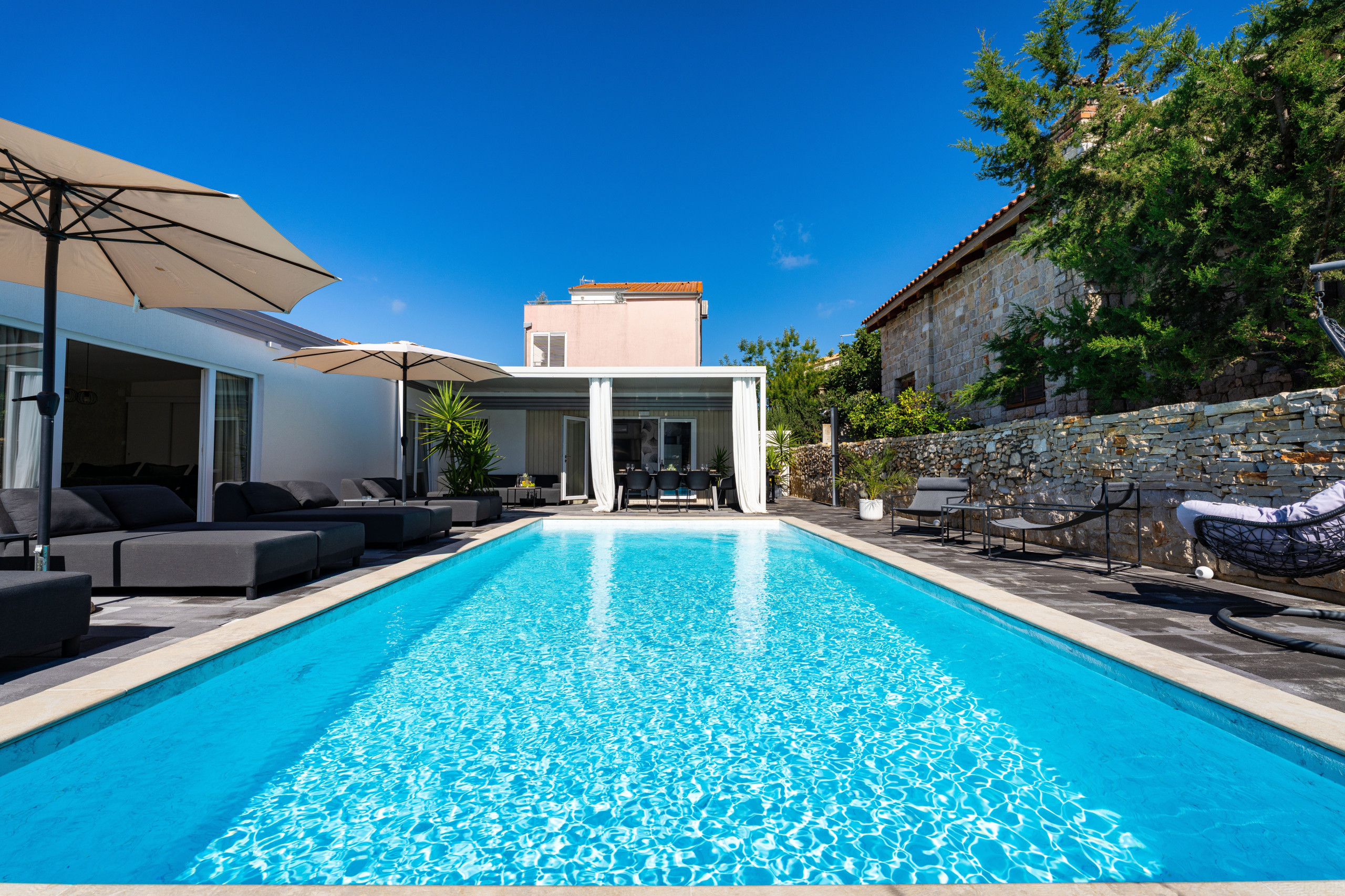 Un salon/salle à manger bien éclairé et joliment décoré domine le rez-de-chaussée. Il est relié à une cuisine entièrement équipée en plan ouvert qui offre un accès direct à la terrasse spacieuse avec vue sur mer, couverte, disposant d'une autre aire de repas extérieure. Trois chambres élégantes sont situées à l'étage, ainsi qu'un grand balcon avec vue sur mer. Chaque chambre dispose de sa propre salle de bain privative contenant une douche, la climatisation et une télévision à écran plat. L'intérieur de la villa Tonka comprend également des toilettes supplémentaires, une salle de sport à domicile et une buanderie. L'espace extérieur inclut votre piscine privée, un espace salon couvert, une douche solaire, des installations de barbecue, un tennis de table, des transats, des parasols et suffisamment de mobilier extérieur. De plus, un espace de stationnement privé suffisant est assuré pour les invités.