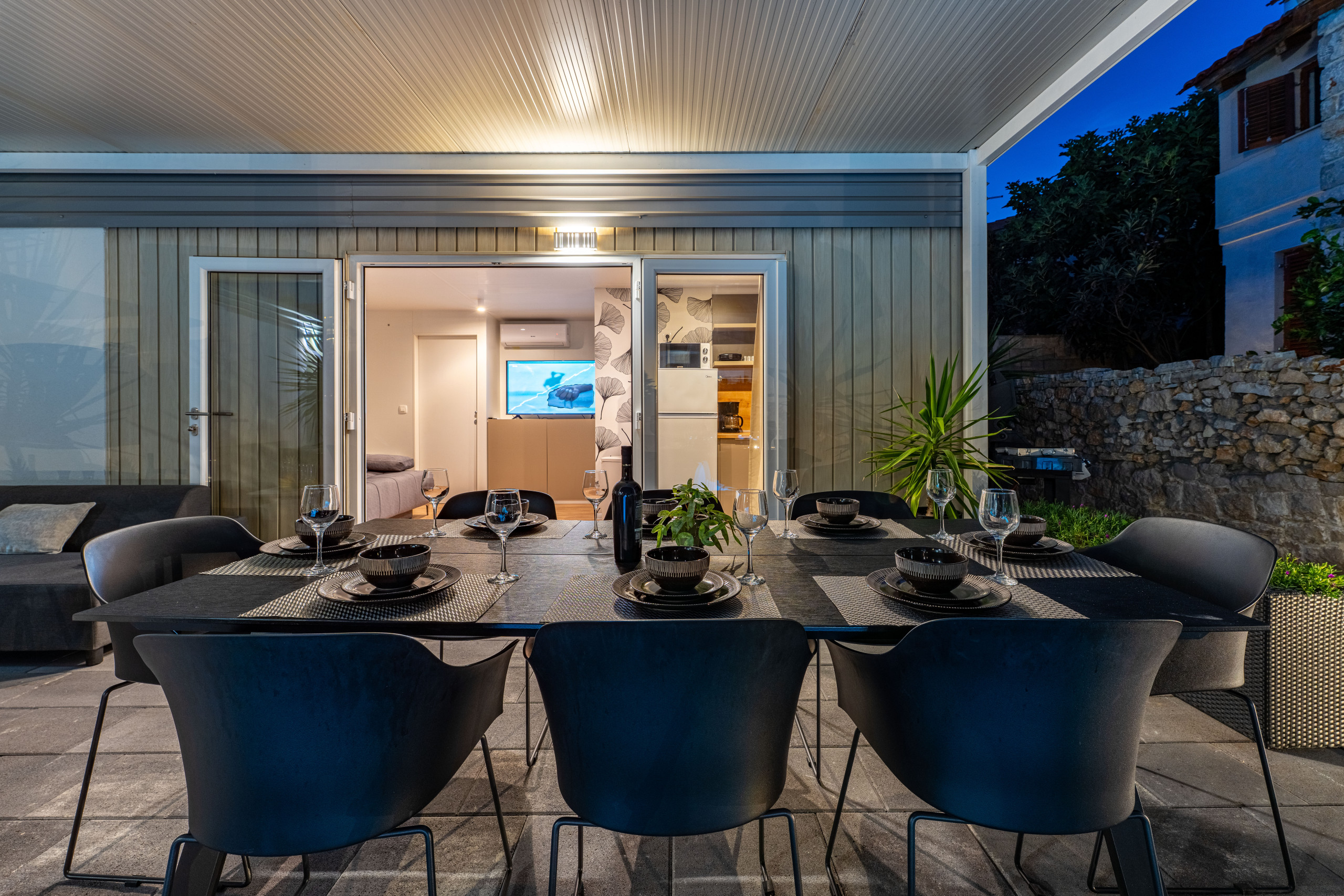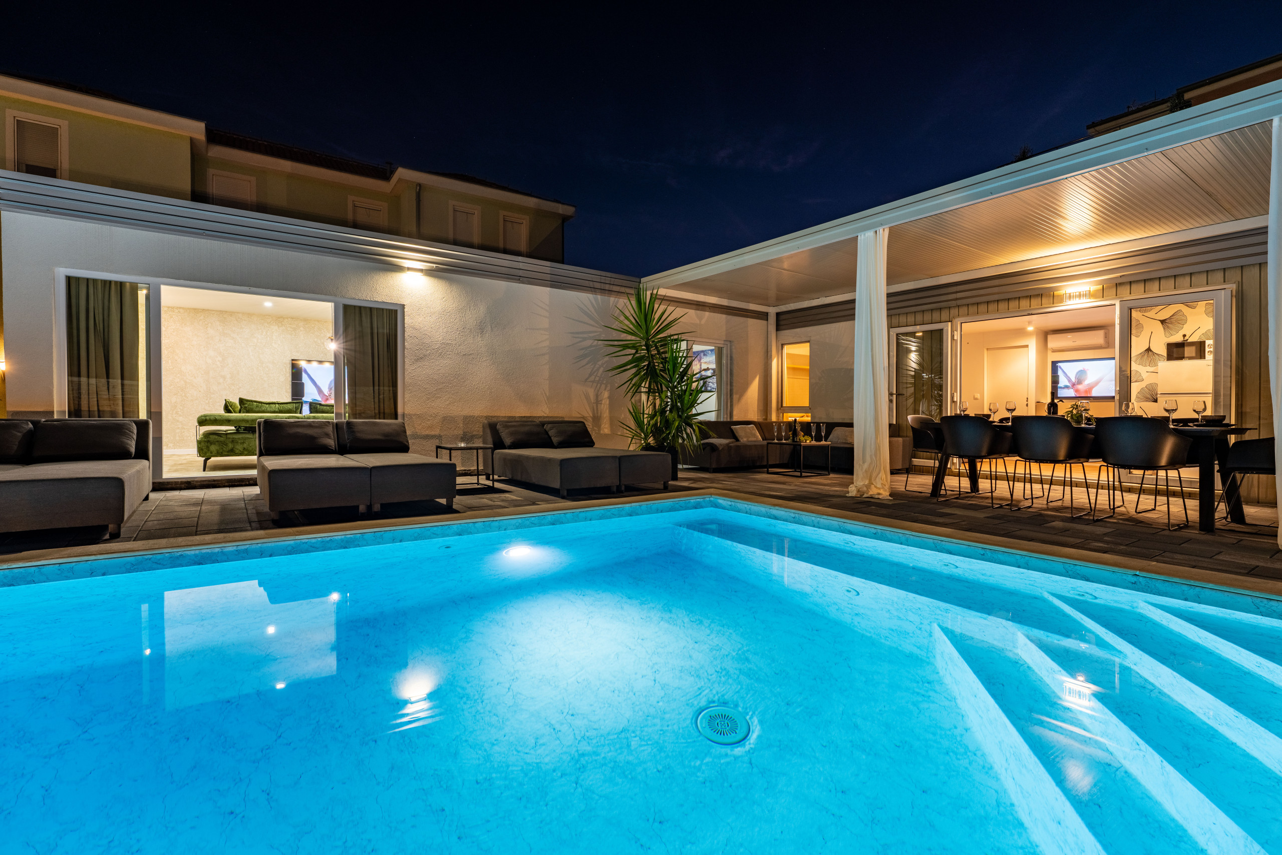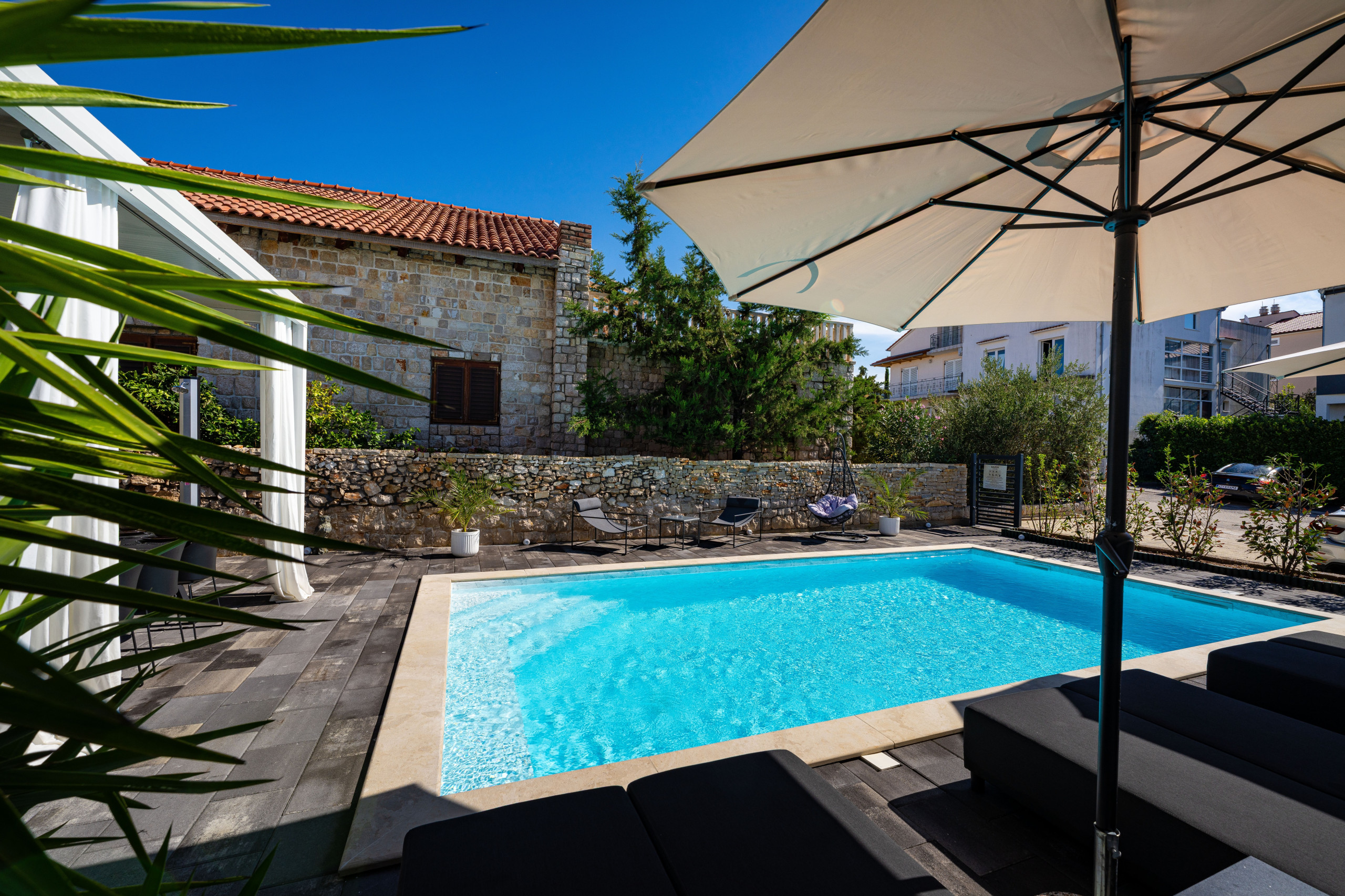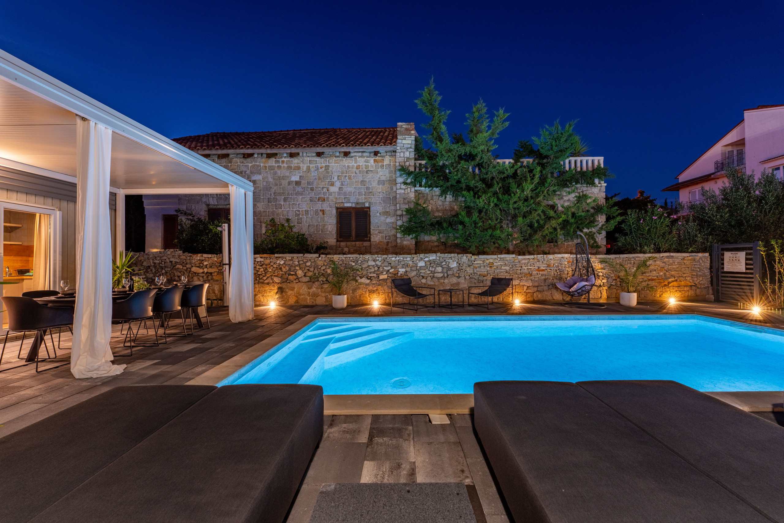 Un salon/salle à manger bien éclairé et joliment décoré domine le rez-de-chaussée. Il est relié à une cuisine entièrement équipée en plan ouvert qui offre un accès direct à la terrasse spacieuse avec vue sur mer, couverte, disposant d'une autre aire de repas extérieure. Trois chambres élégantes sont situées à l'étage, ainsi qu'un grand balcon avec vue sur mer. Chaque chambre dispose de sa propre salle de bain privative contenant une douche, la climatisation et une télévision à écran plat. L'intérieur de la villa Tonka comprend également des toilettes supplémentaires, une salle de sport à domicile et une buanderie. L'espace extérieur inclut votre piscine privée, un espace salon couvert, une douche solaire, des installations de barbecue, un tennis de table, des transats, des parasols et suffisamment de mobilier extérieur. De plus, un espace de stationnement privé suffisant est assuré pour les invités.