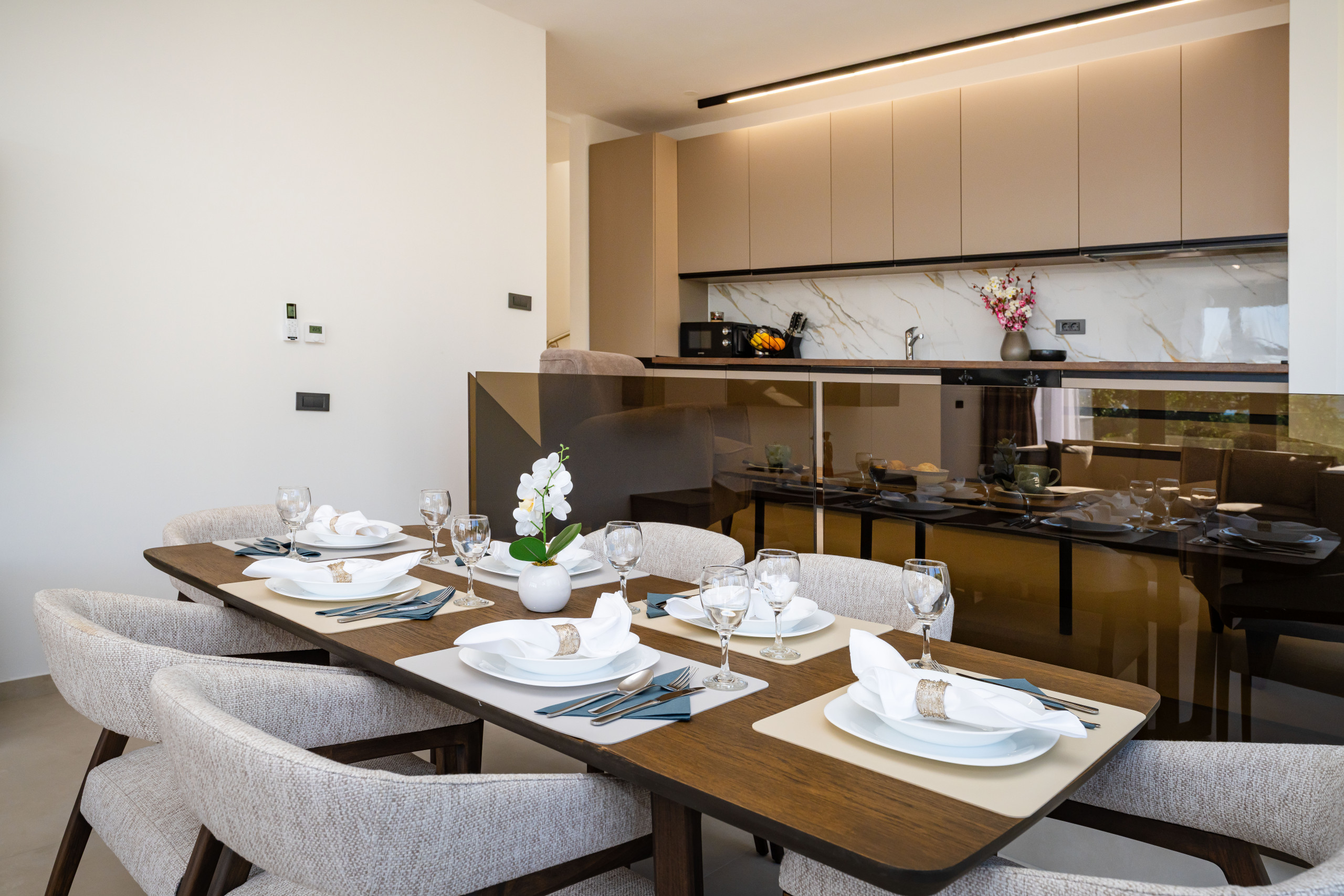 Chaque unité propose trois chambres modernes, chacune disposant d'une salle de bain attenante, d'un climatiseur et d'une télévision, ainsi qu'une terrasse spacieuse avec vue sur la mer et un mobilier extérieur confortable pour vos moments de détente. Il y a également 2 salons/salles à manger bien éclairés ainsi que 2 cuisines entièrement équipées. Au total, 6 chambres avec salles de bain attenantes font de Villa Senti un choix parfait pour les familles ou les groupes d'amis.