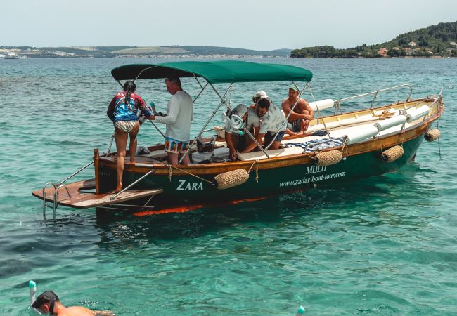 Nous commencerons notre voyage depuis le Centre-Ville de Zadar, avec notre première escale à la pittoresque Baie d'Otrić, où vous pourrez nager, faire du snorkeling et profiter du soleil. Après avoir profité de l'eau, nous nous dirigerons vers Ošljak, la plus petite île habitée de la mer Adriatique. Ici, nous ferons une visite à pied pour explorer son beau parc naturel, ses maisons pittoresques et le mode de vie local. Votre guide partagera des histoires fascinantes et répondra à toutes vos questions.