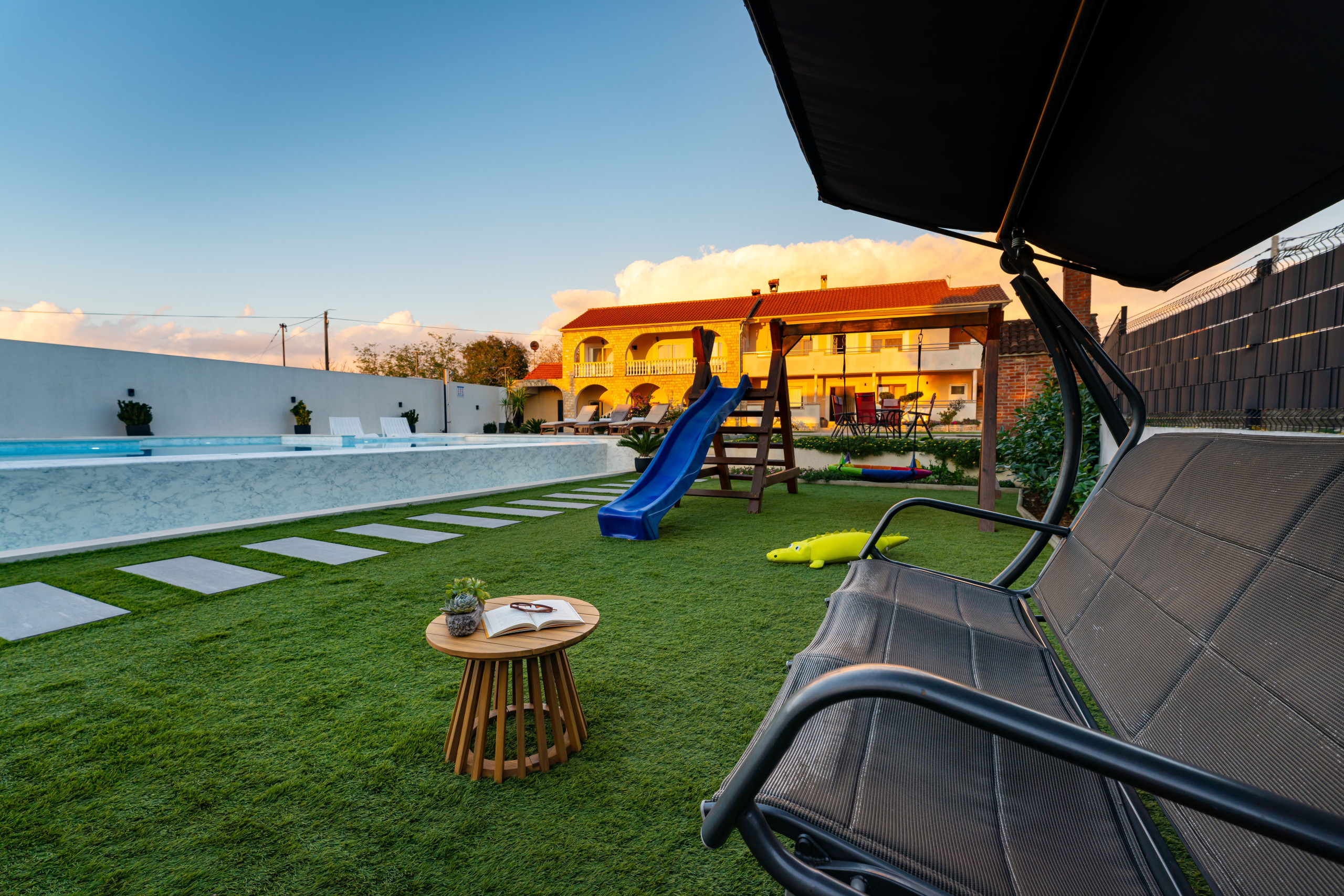Il tuo appartamento completamente climatizzato è composto da 2 camere da letto, ciascuna con il proprio bagno privato, un luminoso soggiorno/sala da pranzo e una cucina completamente attrezzata open space. Ogni stanza ha un accesso diretto alla spaziosa terrazza coperta che si affaccia sulla piscina. La piscina è condivisa con un solo altro appartamento e ha anche una mini piscina per bambini. La tua stupenda area esterna presenta un grande barbecue in pietra tradizionale, un parco giochi per bambini, un grazioso tavolo da taverna attrezzato con un tavolo da pranzo e un ulteriore bagno, 2 docce solari, numerosi lettini prendisole, mobili da giardino e molto altro ancora.