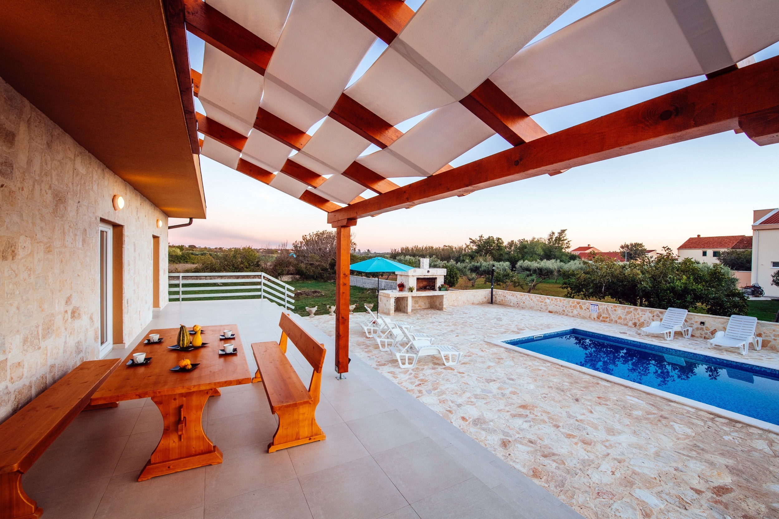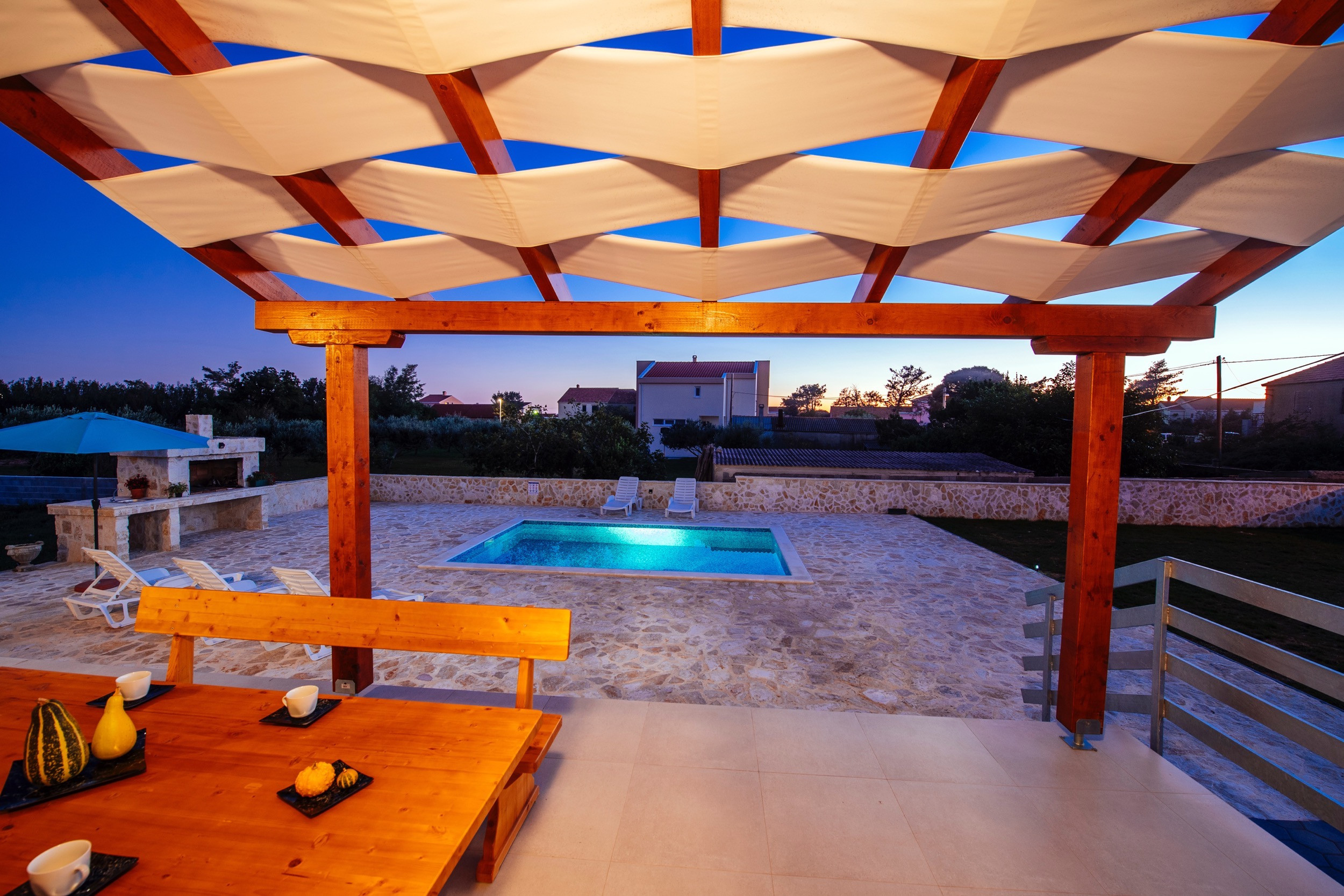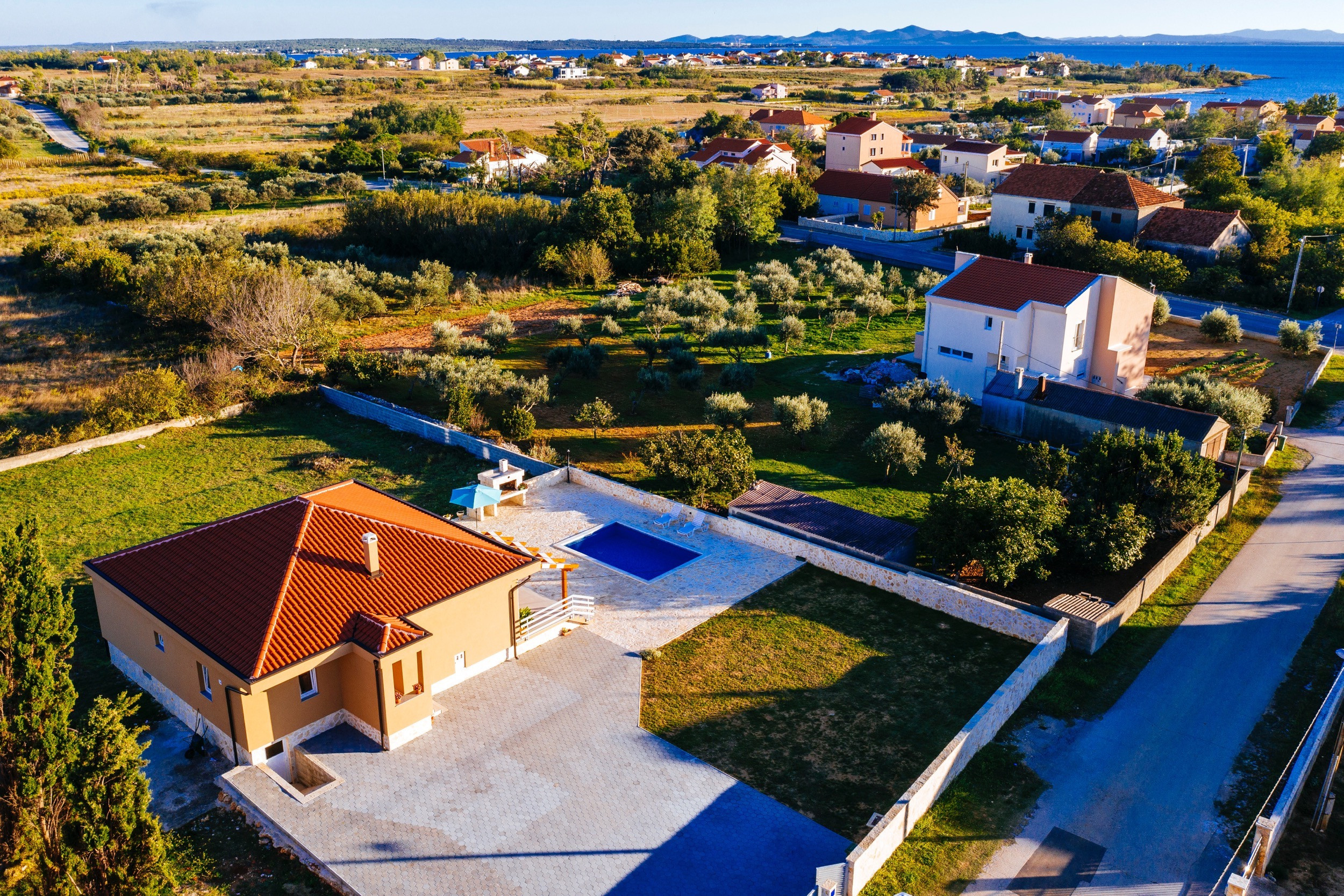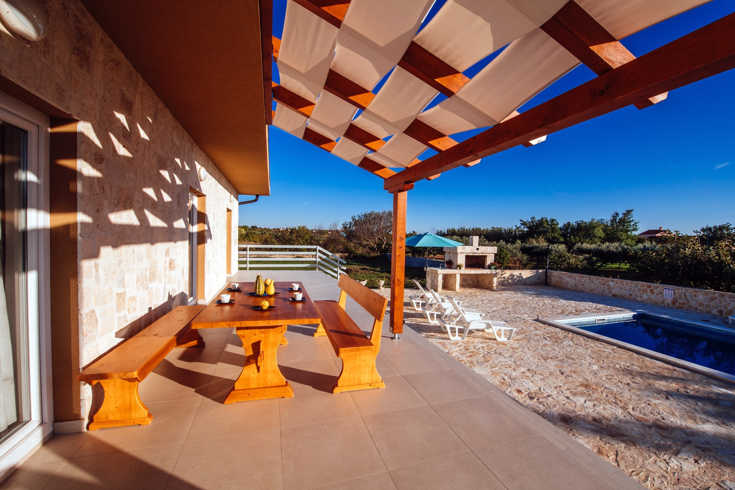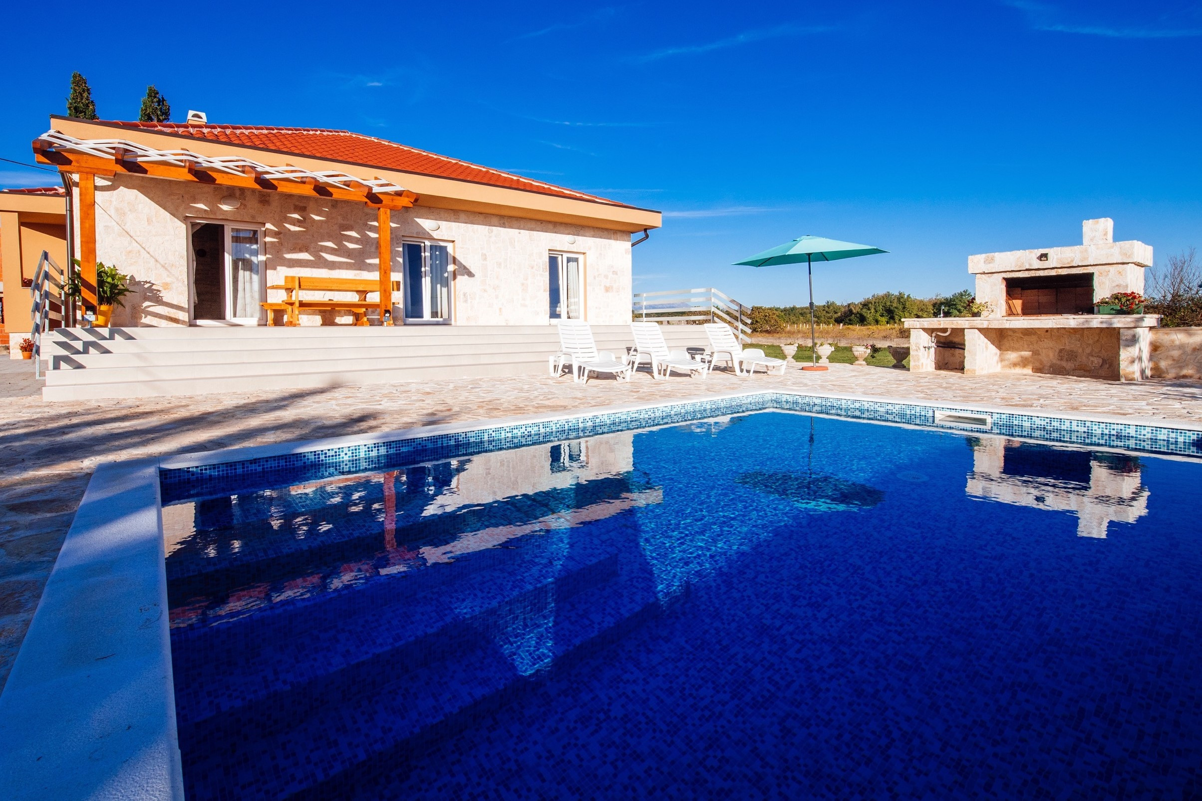 L'interno è composto da un ampio ed elegante soggiorno/sala da pranzo, una cucina completamente attrezzata, 3 camere da letto luminose e 2 moderni bagni. All'esterno, c'è un bel cortile recintato con la vostra piscina privata, una gradevole terrazza e un barbecue in pietra. La piscina è aperta dal 15/05 al 15/10. Da lì avete una vista sulla bellissima montagna del Velebit. La spiaggia sabbiosa più vicina è a soli 500 m di distanza e i ristoranti, i caffè e i negozi di alimentari sono ancora più vicini. Controllato e scelto da Poolincluded.com per la sua posizione perfetta e il grande comfort.