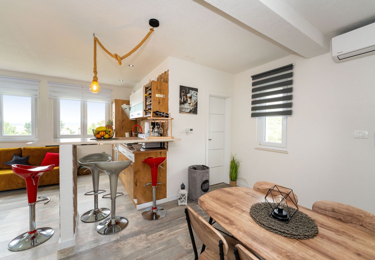 Twój urokliwy apartament znajduje się na drugim piętrze i oferuje jedną wygodną sypialnię, nowoczesną łazienkę z pralką, w pełni wyposażoną kuchnię otwartą oraz przestronny salon/jadalnię z bezpośrednim wyjściem na prywatny taras. Oferujący wspaniały panoramiczny widok na Morze Adriatyckie, zapewnia idealne miejsce do relaksu w towarzystwie rodziny i przyjaciół. Posiada ładną strefę jadalnianą i mnóstwo mebli outdoorowych, w tym leżaki. Dla gości zabezpieczyliśmy 2 prywatne miejsca parkingowe, a także szybkie połączenie Wi-Fi.