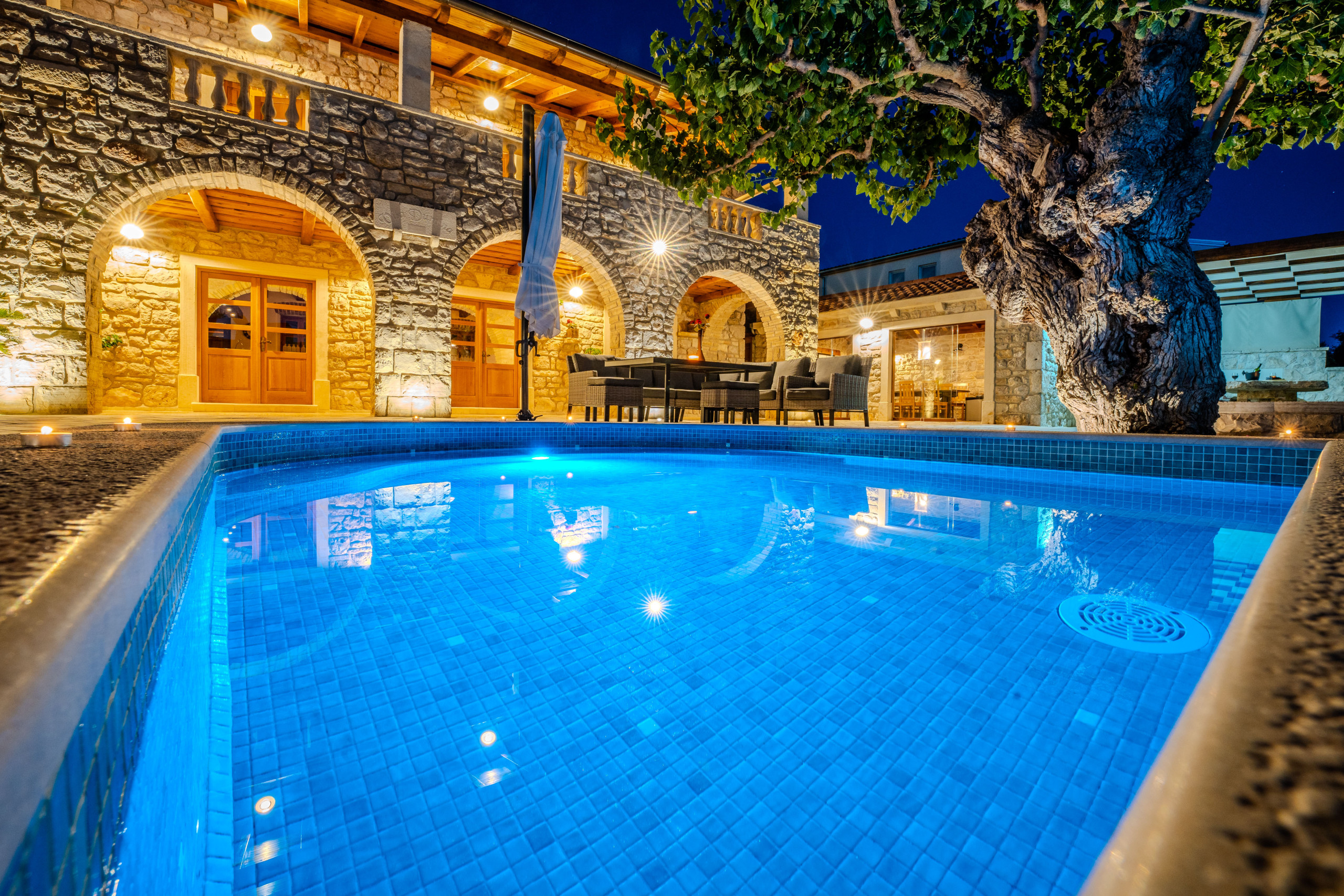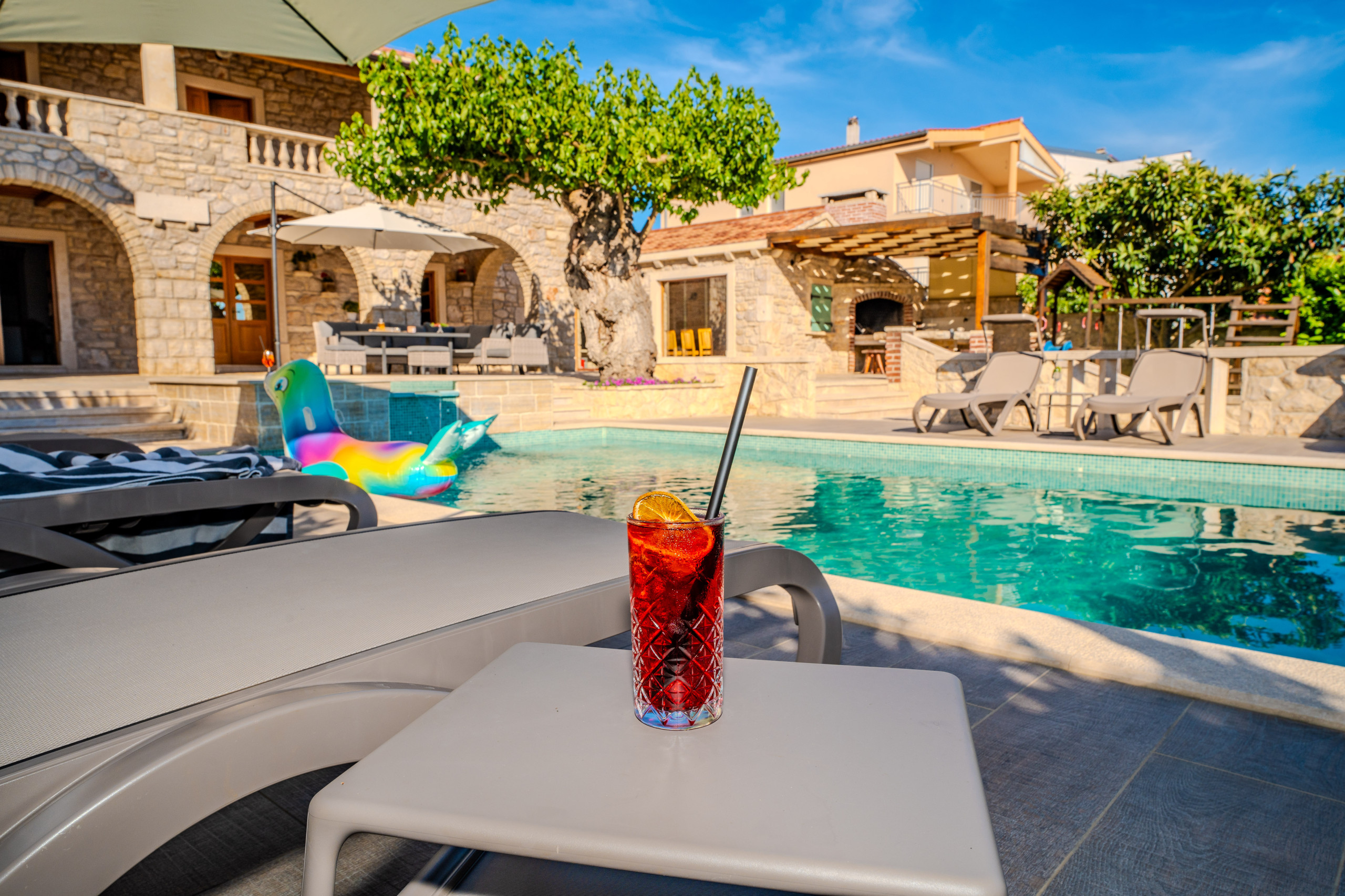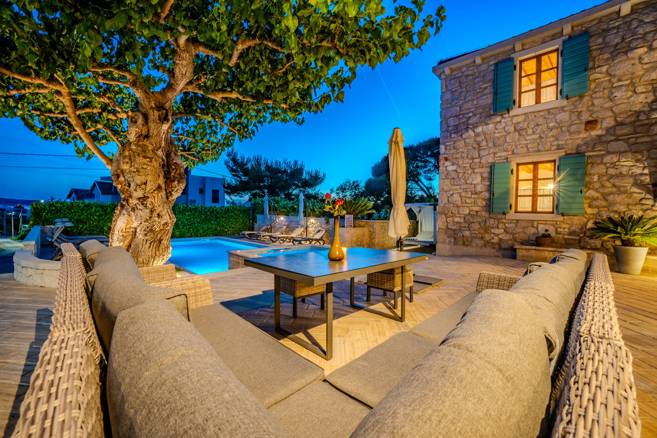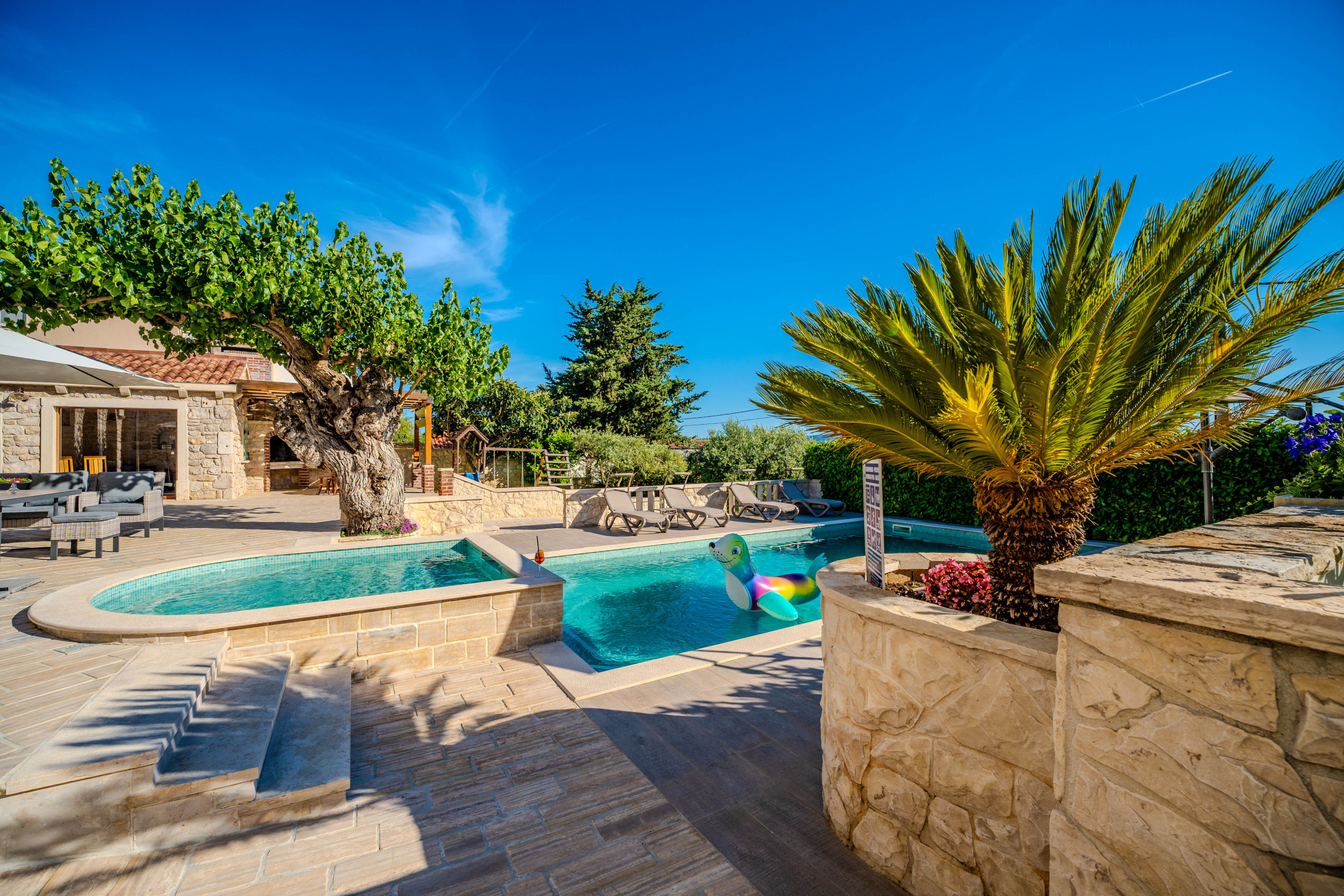 Na wolnym powietrzu goście są witani przez prywatny, ogrzewany basen o powierzchni 50 m², leżaki, parasole, domek grillowy i taras z widokiem na morze, rozciągający się nad Morzem Adriatyckim. Dla podróżujących samochodami elektrycznymi Villa Dumina oferuje wygodną stację ładowania pojazdów elektrycznych na miejscu. Młodsi goście są doskonale obsłużeni dzięki placu zabaw dla dzieci i osobnemu basenowi dla dzieci. Obszerne użycie autentycznego kamienia dalmatyńskiego podkreśla ponadczasowy charakter willi i jej związek z otoczeniem.