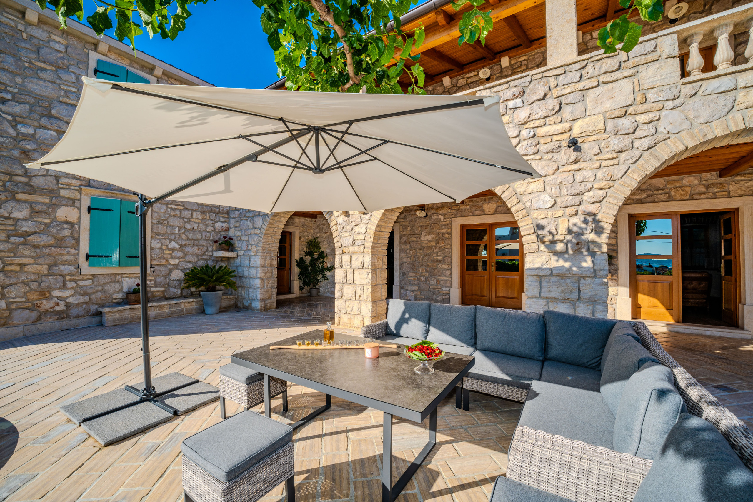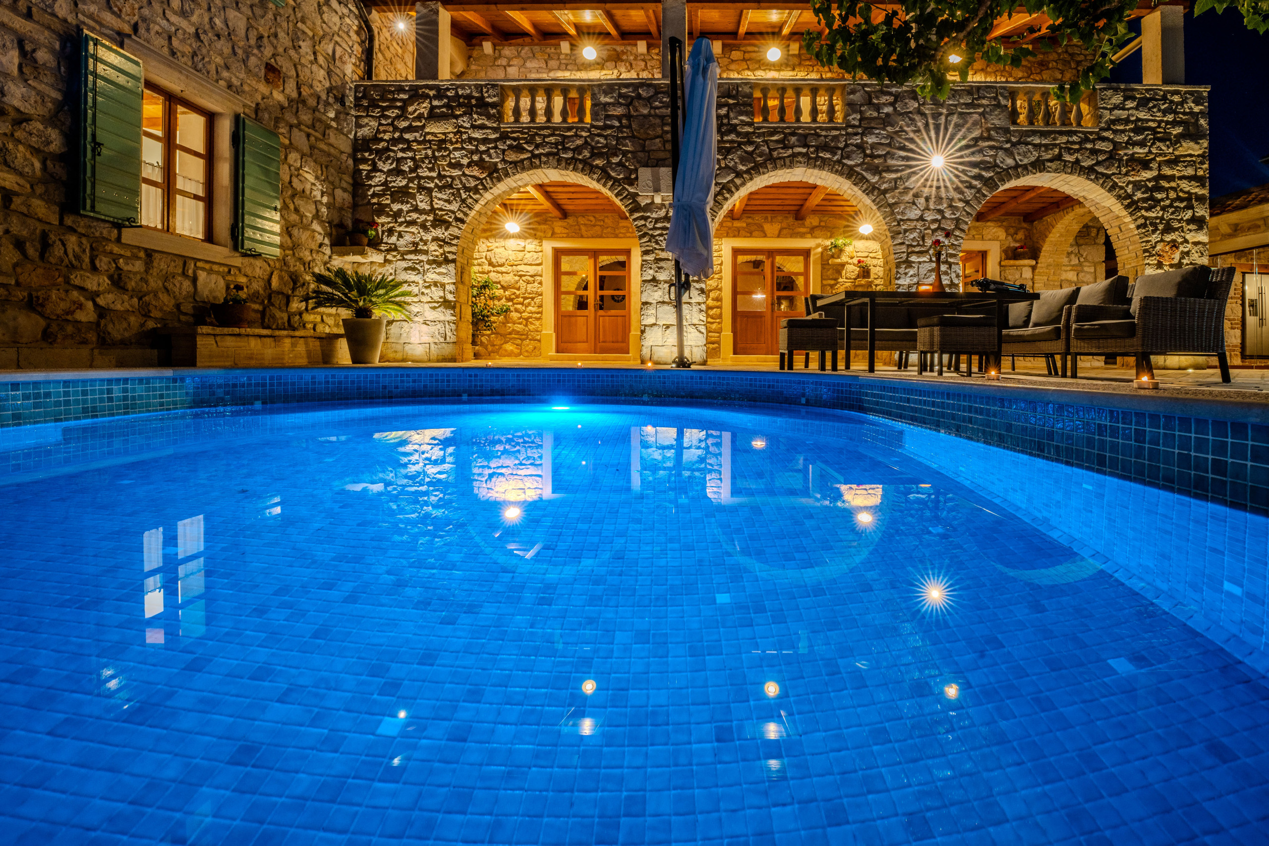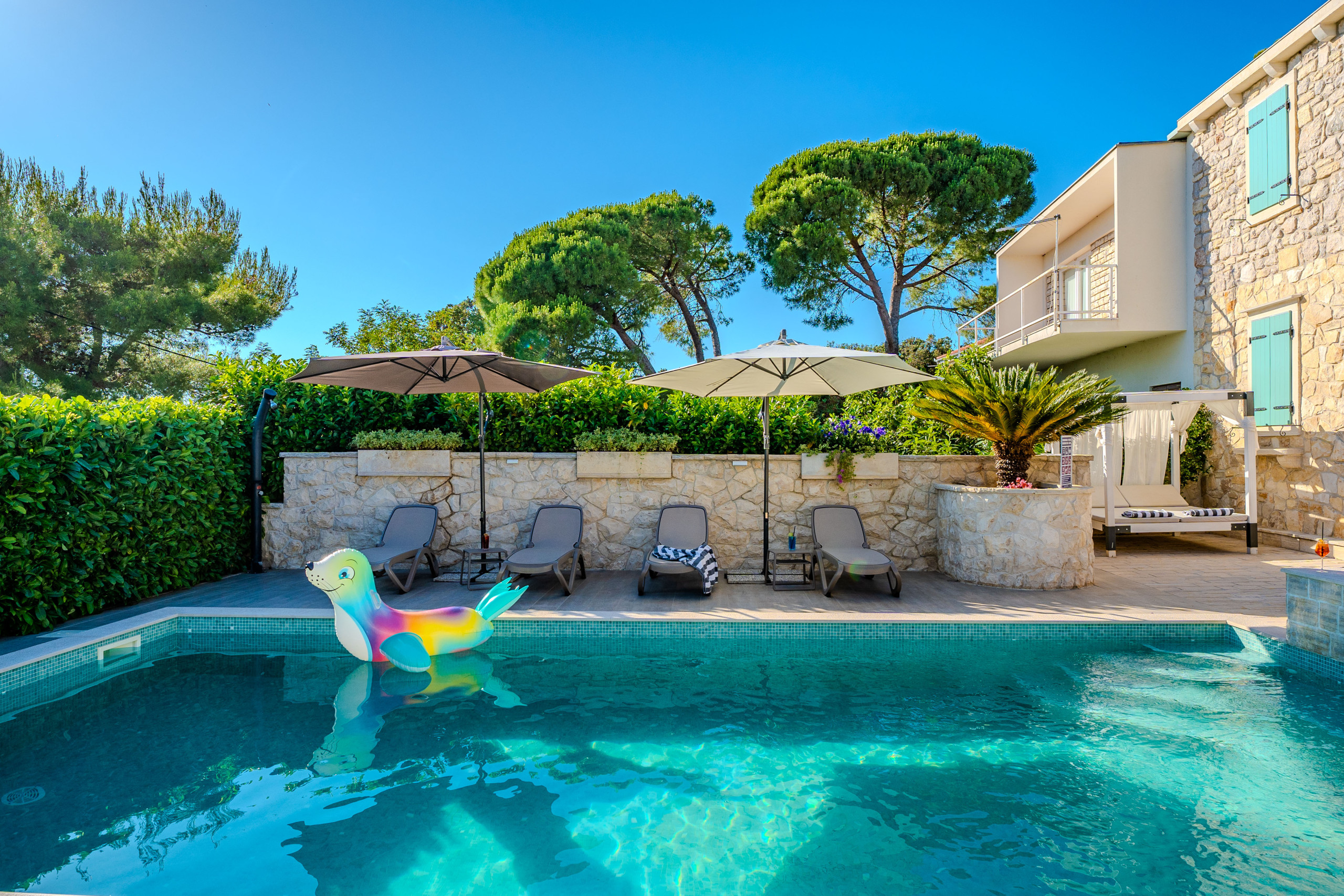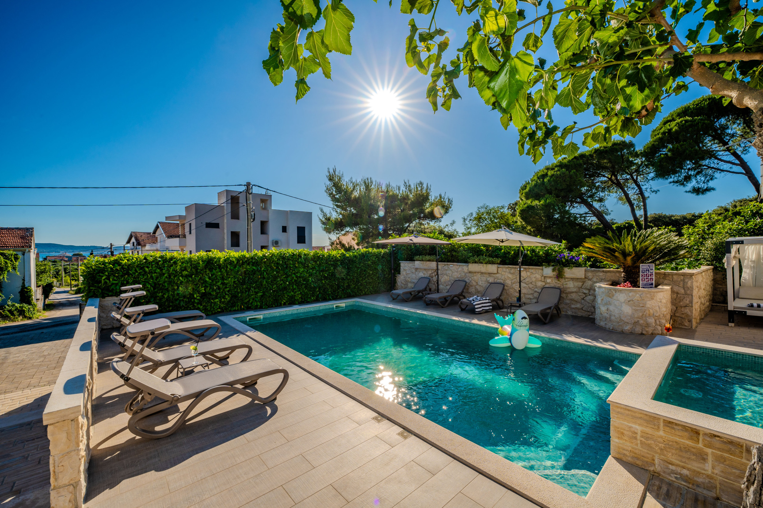 Na wolnym powietrzu goście są witani przez prywatny, ogrzewany basen o powierzchni 50 m², leżaki, parasole, domek grillowy i taras z widokiem na morze, rozciągający się nad Morzem Adriatyckim. Dla podróżujących samochodami elektrycznymi Villa Dumina oferuje wygodną stację ładowania pojazdów elektrycznych na miejscu. Młodsi goście są doskonale obsłużeni dzięki placu zabaw dla dzieci i osobnemu basenowi dla dzieci. Obszerne użycie autentycznego kamienia dalmatyńskiego podkreśla ponadczasowy charakter willi i jej związek z otoczeniem.