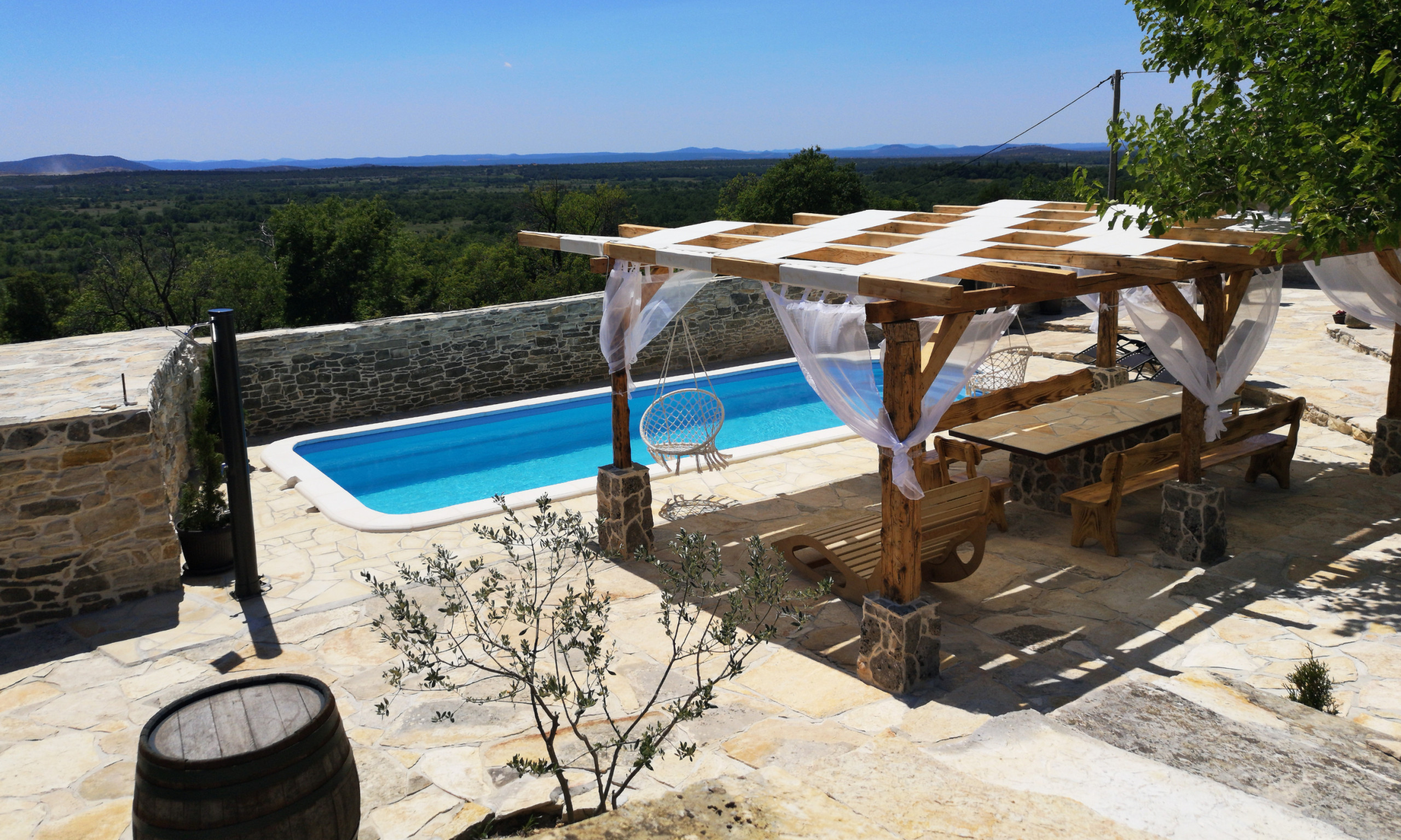 Local charm, great views, and a large courtyard with a private pool. This wonderful newly renovated holiday home is located near Benkovac, in the hinterland of Zadar called Ravni Kotari. This area is famous for its quality wine, stone production, and agriculture. Your accommodation has preserved the authenticity of a typical ancient Dalmatian cottage. The extensive use of authentic Dalmatian stone enhances the villa’s timeless character and connection to its surroundings.