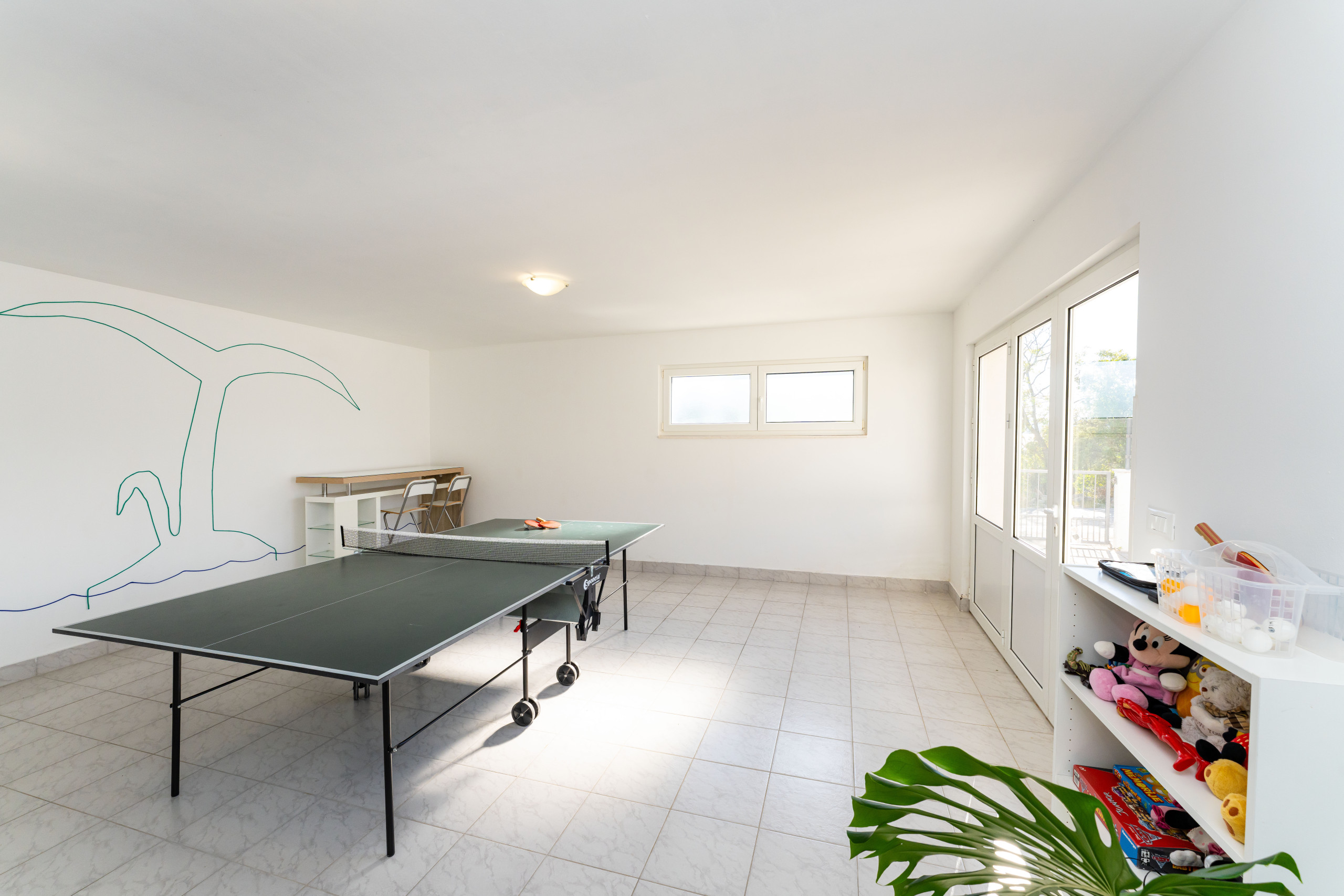 The spacious living area spreads over two floors. On the ground floor there is a bright living/dining room, a fully equipped kitchen which includes a dishwasher, one bedroom and a modern bathroom. First floor features two bedrooms with their own en-suite bathrooms. All rooms in the house are equipped with air conditioning devices. Relax area located in the sub-terrain besides a sauna offers fitness equipment, a billiard table, darts and table tennis. Also, there is a garage at your disposal which provides plenty of secured parking space. The outdoor area of your pet friendly holiday home includes a private fully fenced garden with covered terrace and BBQ, a heated swimming pool and nice sea view patio well equipped with sun loungers.