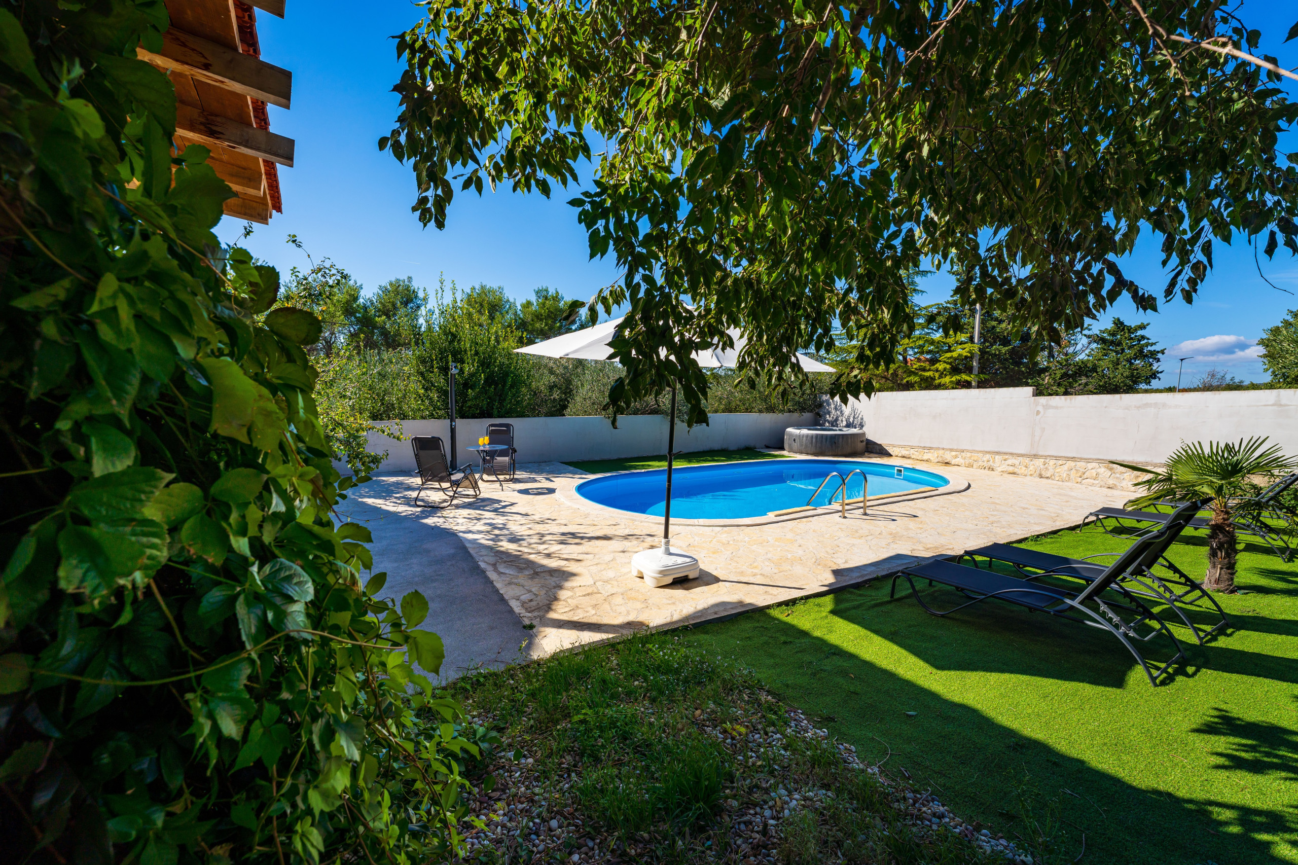 Holiday home Emily consists of a spacious living/dining area, 3 bedrooms, 2 bathrooms, a fully equipped open plan kitchen and a charming covered terrace overlooking the pool, ideal for enjoying your meals in the open. The outdoor area features your private swimming pool, a hot tub, sun shower, plenty of sun loungers, parasols and stone barbecue facility. Also, you can play table tennis and there is a trampoline for the little ones. During a visit by My Dalmatia we were particularly impressed by your hosts hospitality, he lives next door and will happily provide you fresh fruit and vegetables from his garden.