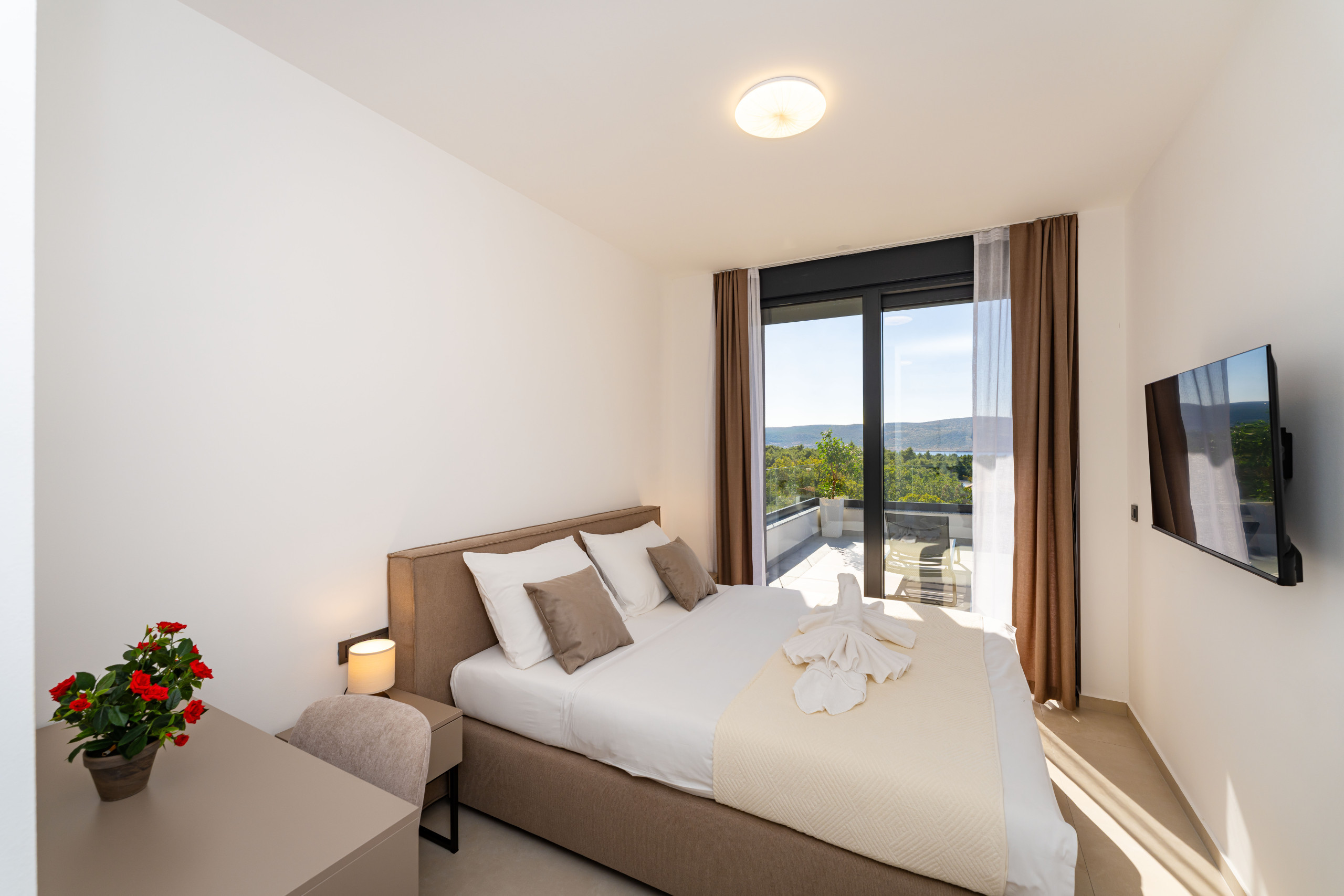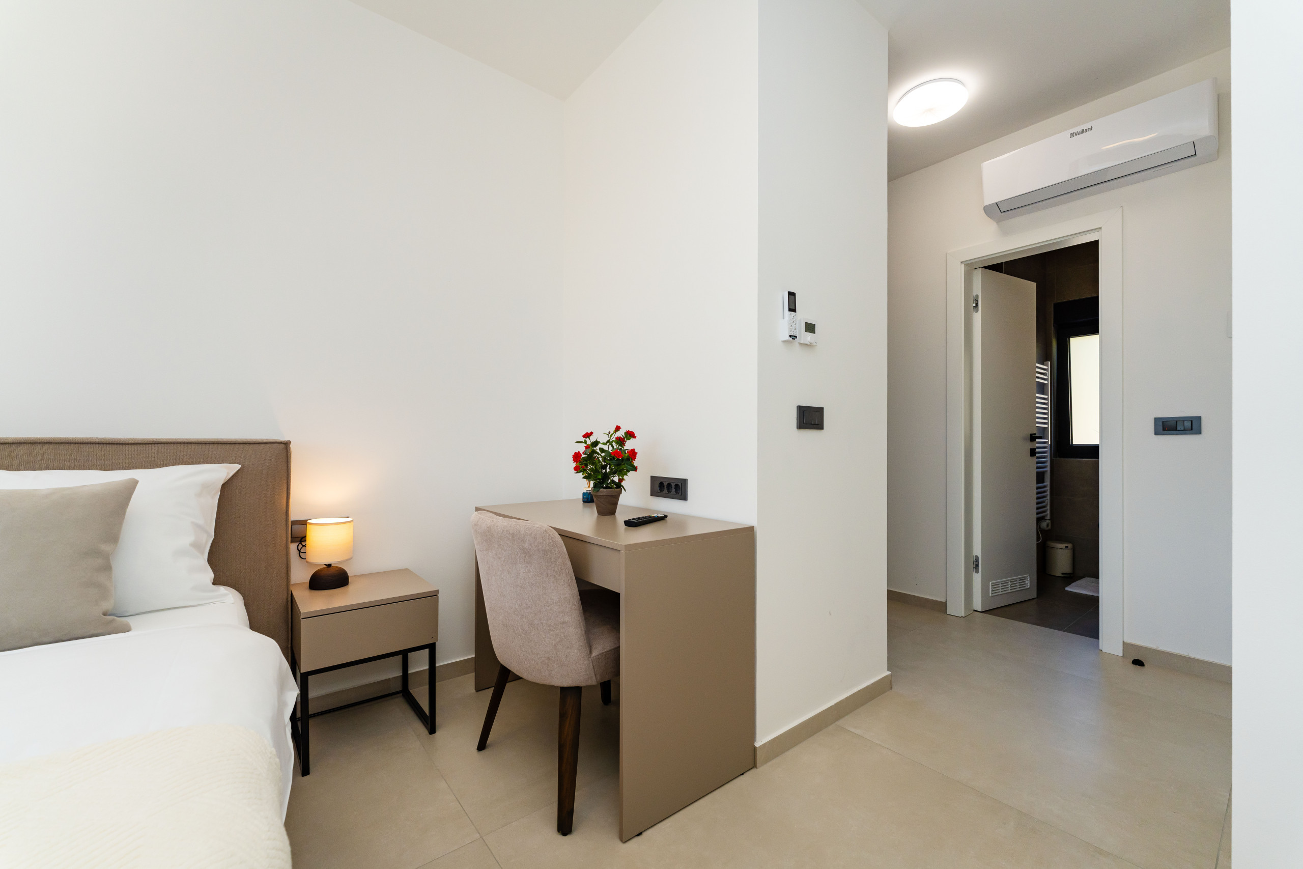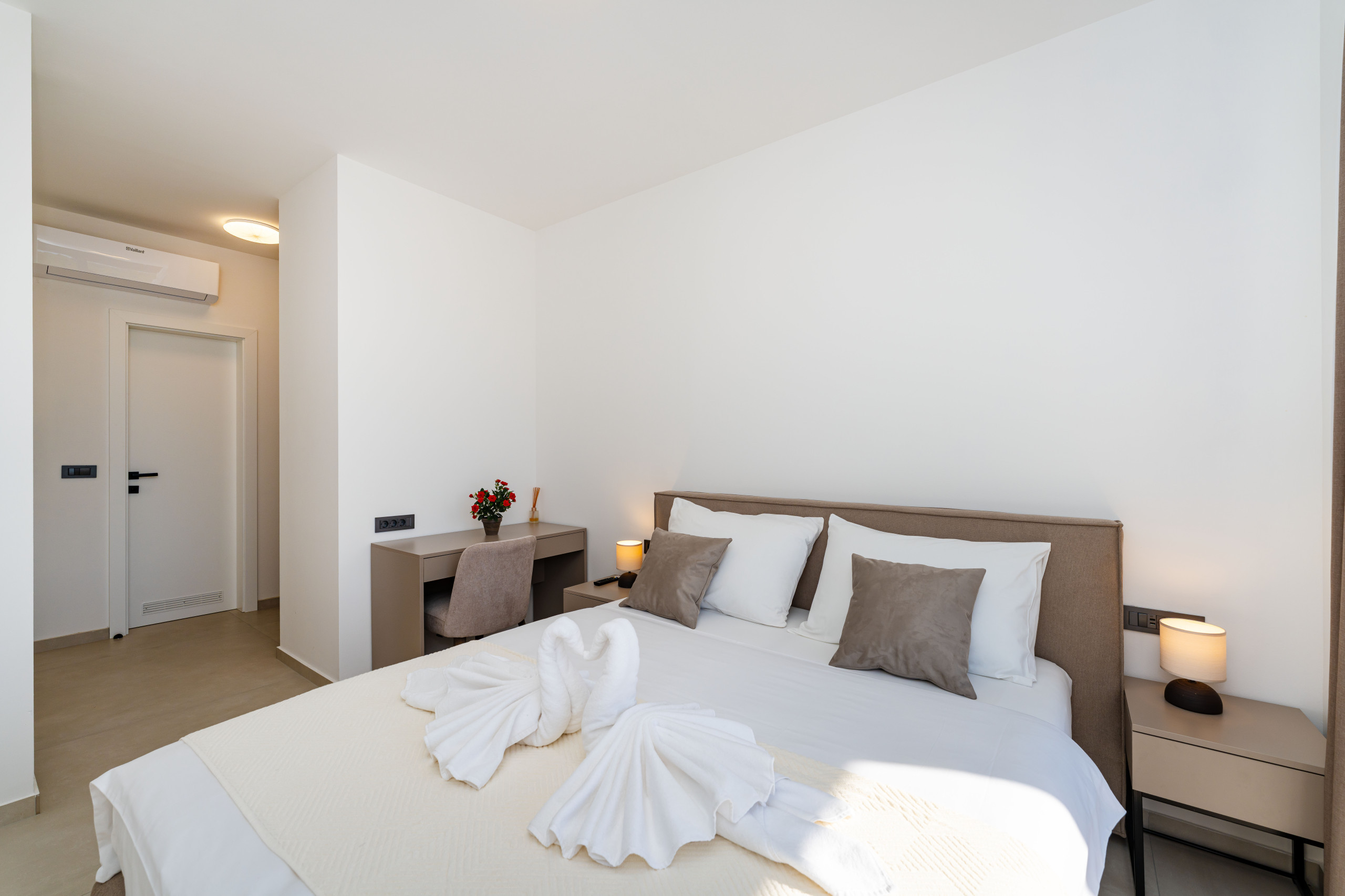 Each unit offers three modern bedrooms, each featuring an en-suite bathroom, air-conditioning unit and TV as well as a spacious sea-view terrace with comfortable outdoor furniture for your relaxing moments. There are also 2 well-lit living/dining rooms as well as 2 fully equipped kitchens. There are 6 bedrooms with en suite bathrooms in total, making Villa Senti a perfect choice for families or groups of friends.