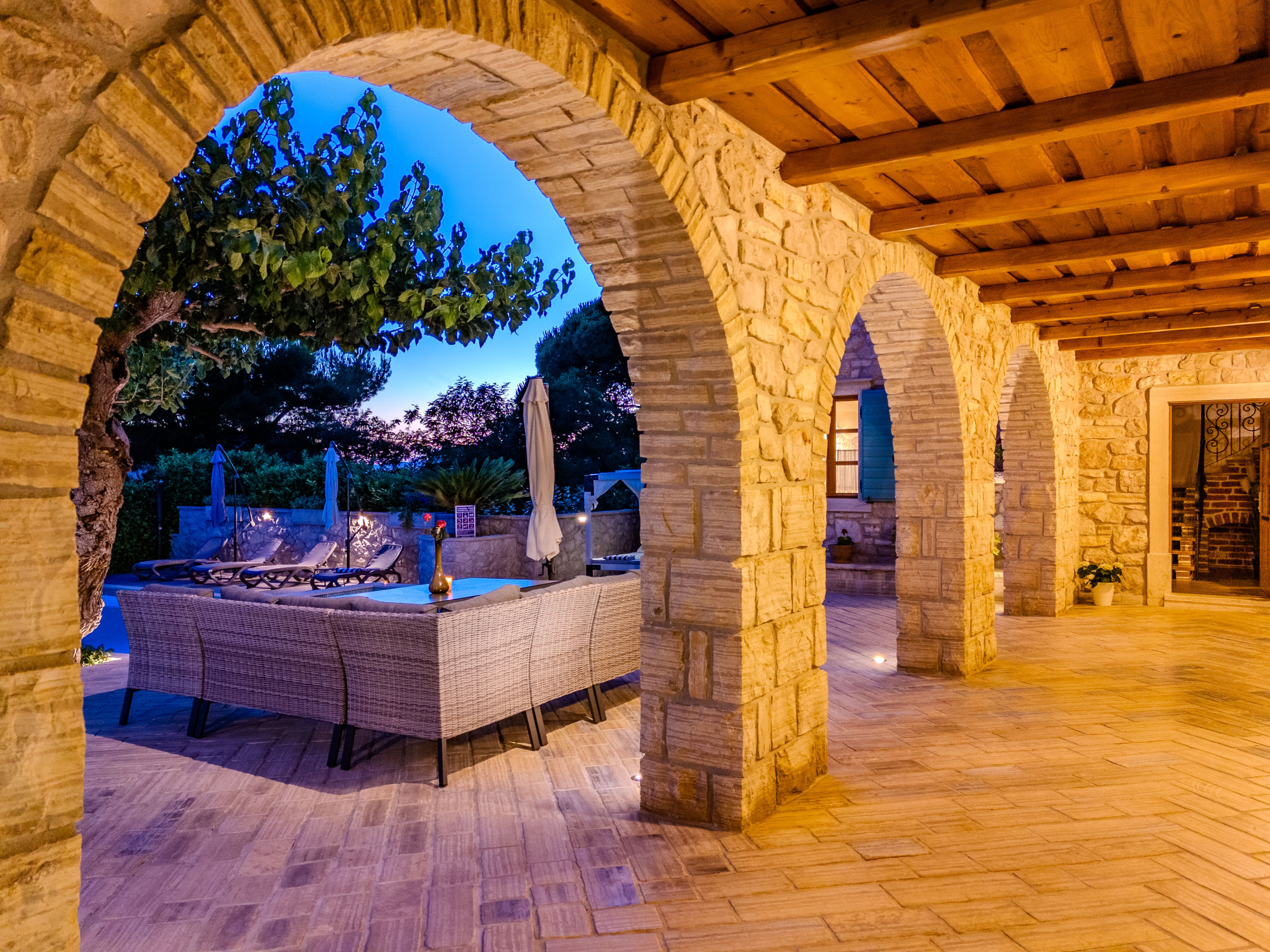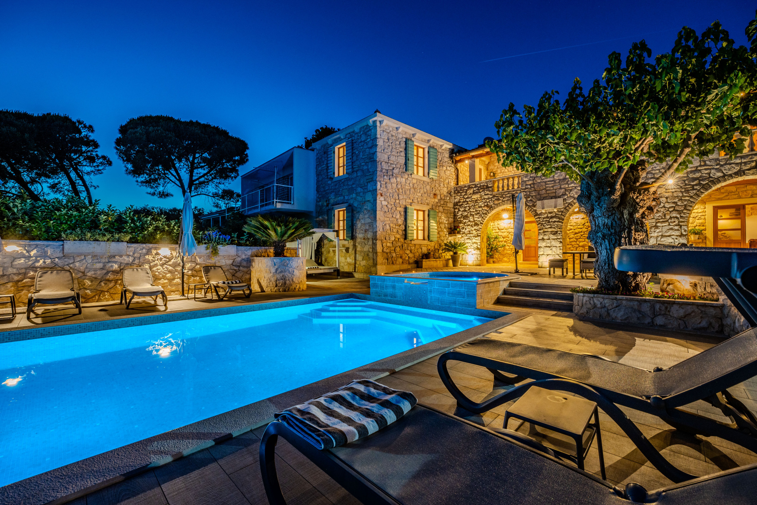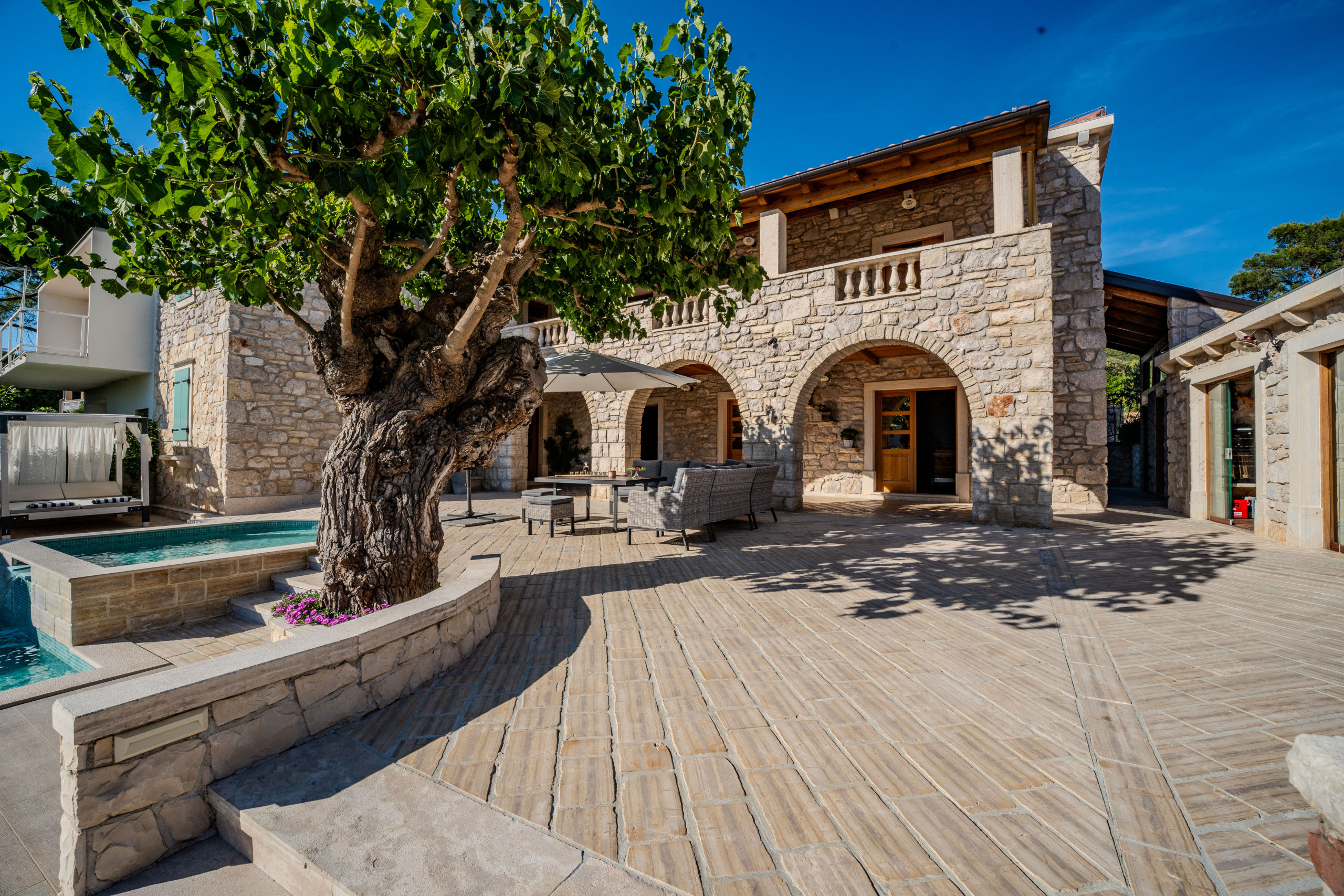 The villa includes a fully equipped kitchen, a spacious living area with seating for ten, and a cozy fireplace that adds warmth and charm. For relaxation and recreation, guests can enjoy table tennis, bicycles, an indoor gym, and a private sauna. Blending classic rustic elegance with modern comfort, Villa Dumina showcases traditional Dalmatian architecture throughout. A highlight of the property is its traditional Dalmatian tavern, featuring a stone fireplace and large glass doors—an ideal setting for shared meals and unforgettable evenings.